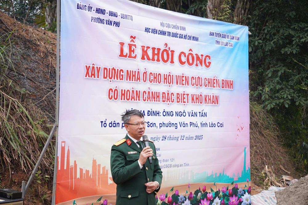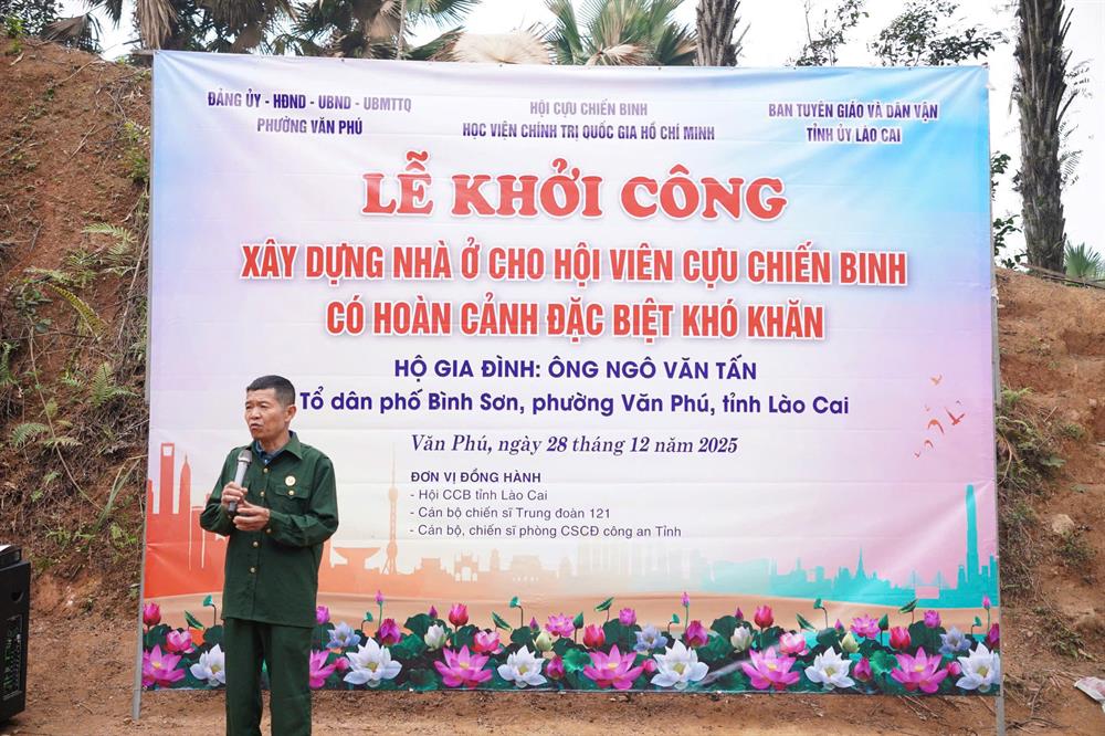 Ngày 28/12/2025, Đoàn công tác của Hội Cựu chiến binh (CCB) Học viện Chính trị quốc gia Hồ Chí Minh phối hợp với lãnh đạo Ban Tuyên giáo và Dân vận tỉnh Lào Cai, Hội Cựu Chiến binh tỉnh Lào Cai, Đảng ủy - UBND, HĐND phường Văn Phú, tỉnh Lào Cai và một số tổ chức, nhà hảo tâm tổ chức trao kinh phí ủng hộ xây dựng nhà tình nghĩa cho hội viên CCB có hoàn cảnh đặc biệt khó khăn Ngô Văn Tấn tại Tổ dân phố Bình Sơn, phường Văn Phú, tỉnh Lào Cai.