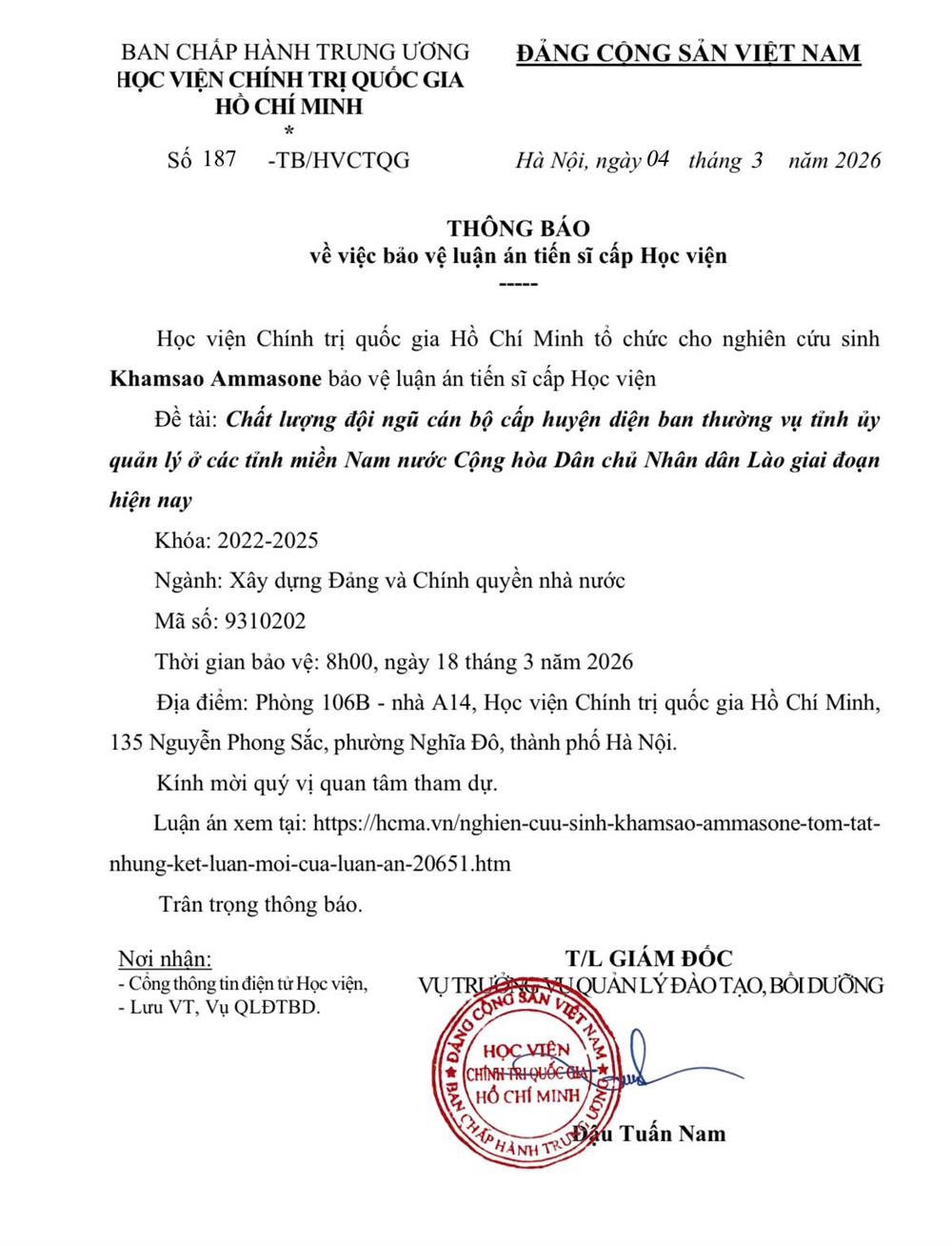 Thông báo tổ chức bảo vệ luận án tiến sĩ cho Nghiên cứu sinh Khamsao Ammasone