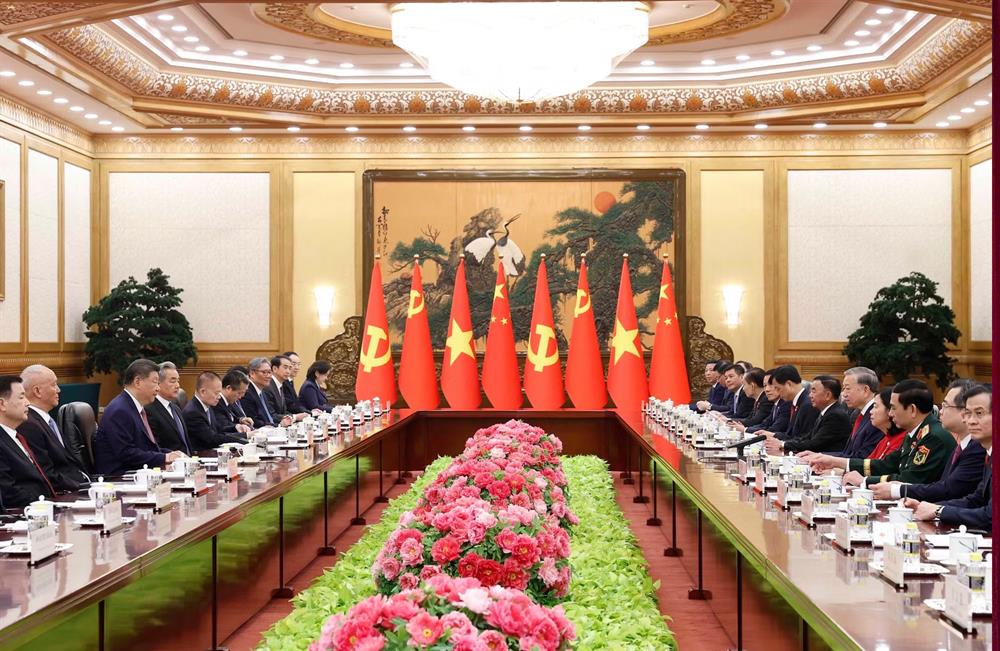 Tổng Bí thư, Chủ tịch nước Trung Quốc Tập Cận Bình nhiệt liệt chào mừng Tổng Bí thư, Chủ tịch nước Tô Lâm và Phu nhân cùng Đoàn đại biểu cấp cao Đảng, Nhà nước Việt Nam thăm cấp Nhà nước tới Trung Quốc; nhiệt liệt chúc mừng đồng chí Tô Lâm vừa được Quốc hội Khóa XVI Việt Nam tín nhiệm bầu giữ cương vị Chủ tịch nước. Tổng Bí thư, Chủ tịch nước Tập Cận Bình bày tỏ trân trọng việc đồng chí Tô Lâm thăm Trung Quốc đầu tiên sau thành công rất tốt đẹp của Đại hội Đảng lần thứ XIV và Việt Nam hoàn tất việc kiện toàn chức danh lãnh đạo Nhà nước, thể hiện sự coi trọng cao, ưu tiên hàng đầu của Đảng, Nhà nước Việt Nam và của Tổng Bí thư, Chủ tịch nước Tô Lâm đối với quan hệ hữu nghị truyền thống, hợp tác chiến lược toàn diện Trung-Việt, cũng như tính chất chiến lược và tầm mức cao của quan hệ song phương.