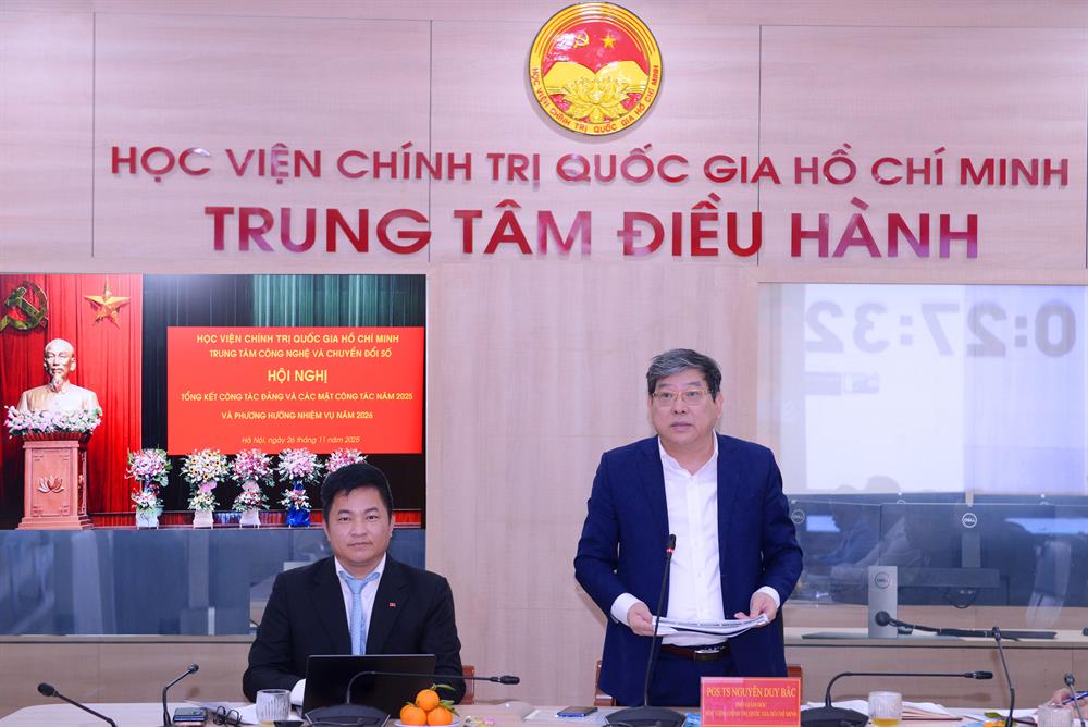 Sáng ngày 26/11/2025, Trung tâm Công nghệ và Chuyển đổi số, Học viện Chính trị quốc gia Hồ Chí Minh tổ chức Hội nghị tổng kết công tác đảng và các mặt công tác năm 2025, triển khai phương hướng, nhiệm vụ năm 2026. Hội nghị không chỉ mang tính chất tổng kết mà còn là diễn đàn quan trọng để định hình lại tư duy quản trị số, đánh giá toàn diện năng lực tham mưu và vận hành hạ tầng công nghệ của đơn vị "đầu não" về chuyển đổi số tại Học viện. Hội nghị vinh dự được đón tiếp PGS,TS Nguyễn Duy Bắc, Phó Giám đốc Học viện dự và chủ trì chỉ đạo.