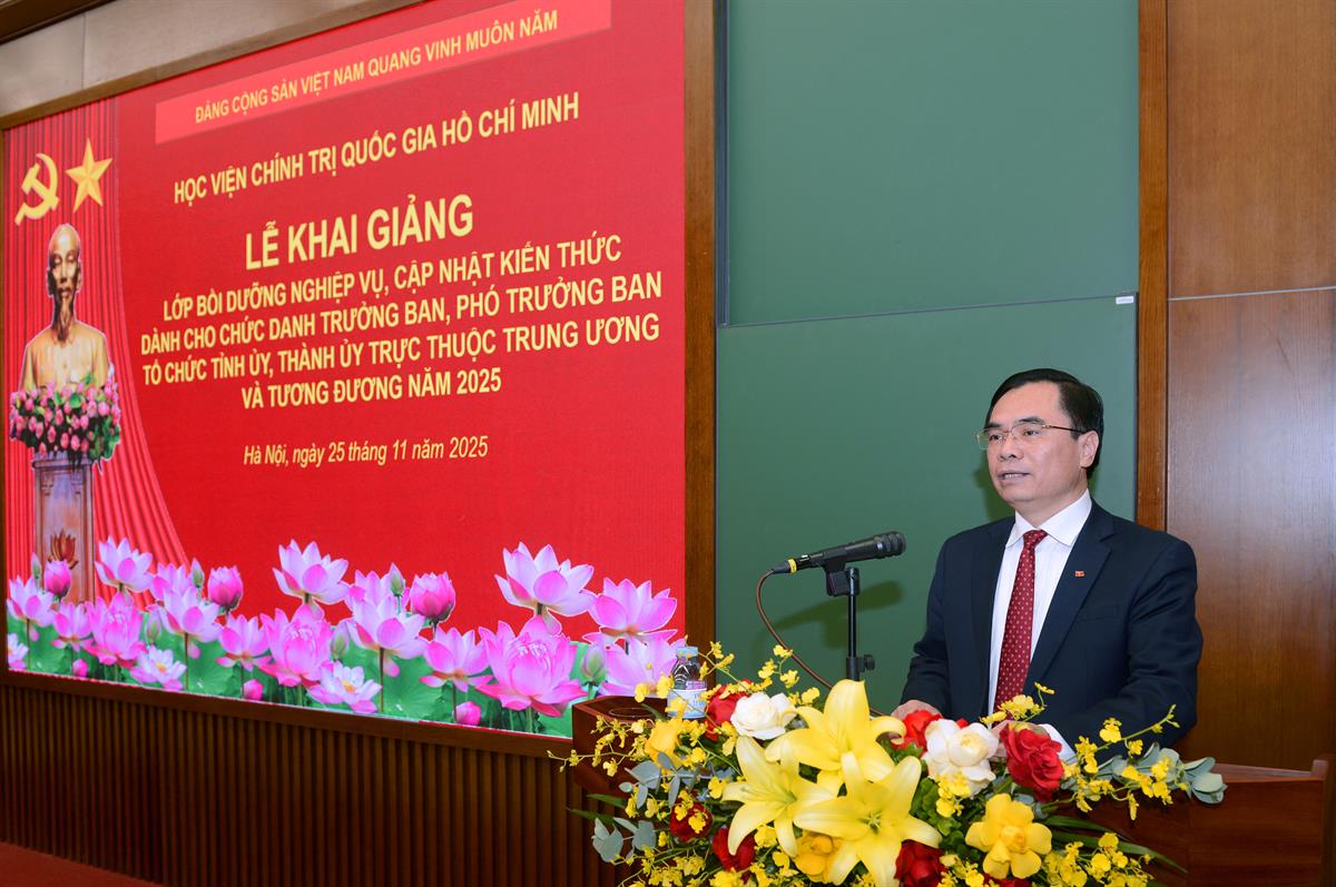 Thực hiện Kế hoạch bồi dưỡng, cập nhật kiến thức dành cho chức danh lãnh đạo, quản lý trong hệ thống chính trị, sáng ngày 25/11/2025, tại Hà Nội, Học viện Chính trị quốc gia Hồ Chí Minh tổ chức khai giảng Lớp bồi dưỡng nghiệp vụ, cập nhật kiến thức dành cho chức danh Trưởng ban, Phó Trưởng Ban Tổ chức các tỉnh ủy, thành ủy trực thuộc Trung ương và tương đương năm 2025. PGS,TS Dương Trung Ý, Phó Giám đốc Học viện dự và chủ trì buổi lễ.