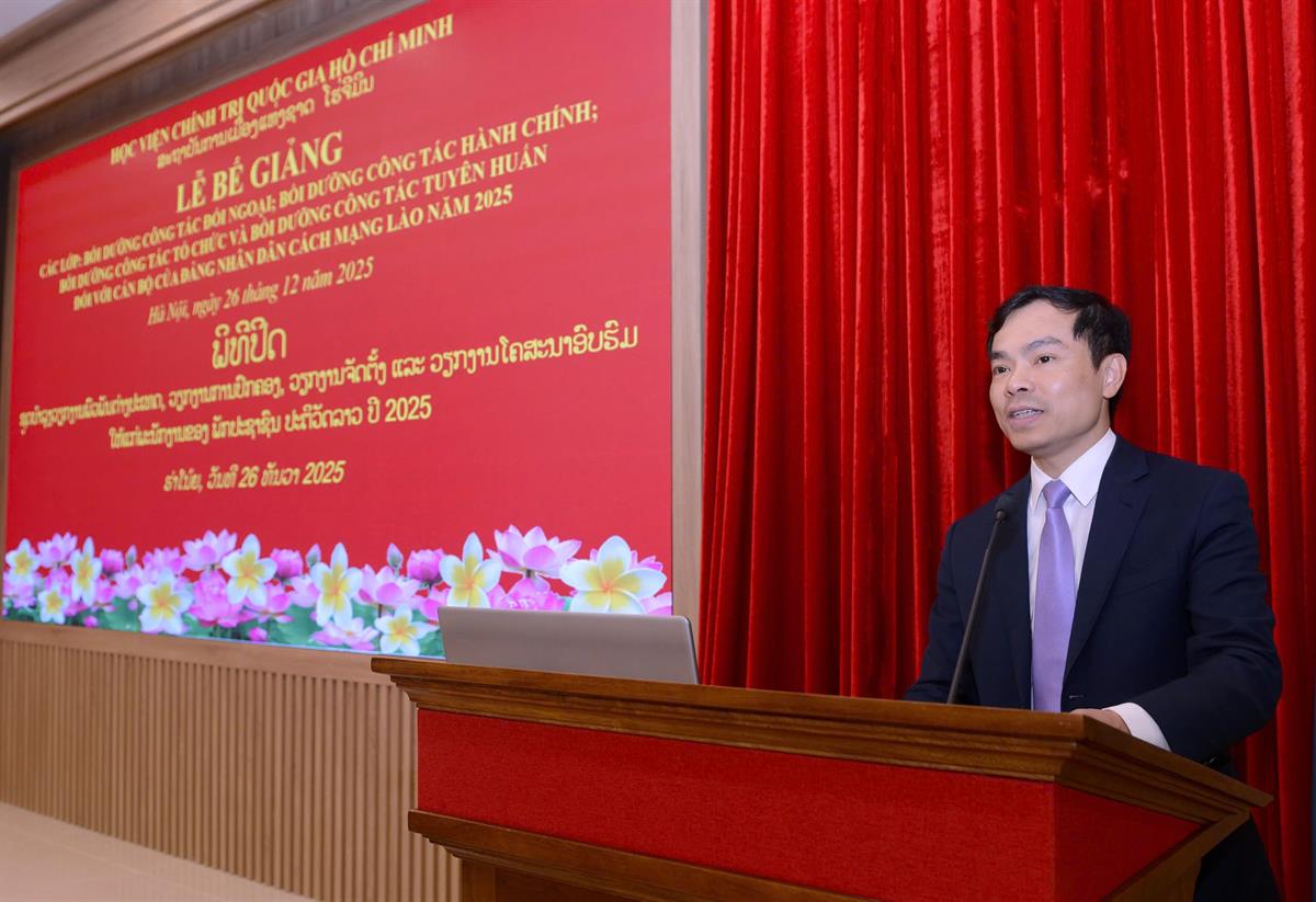 Chiều 26/12/2025, tại Hà Nội, Học viện Chính trị quốc gia Hồ Chí Minh tổ chức Lễ bế giảng các lớp: Bồi dưỡng công tác Đối ngoại; Bồi dưỡng công tác Hành chính; Bồi dưỡng công tác Tổ chức và Bồi dưỡng công tác Tuyên huấn đối với cán bộ của Đảng Nhân dân Cách mạng Lào năm 2025. PGS,TS Nguyễn Mạnh Hùng, Phó Giám đốc Học viện, Phó Chủ tịch Hội đồng Lý luận Trung ương dự và chủ trì buổi lễ.