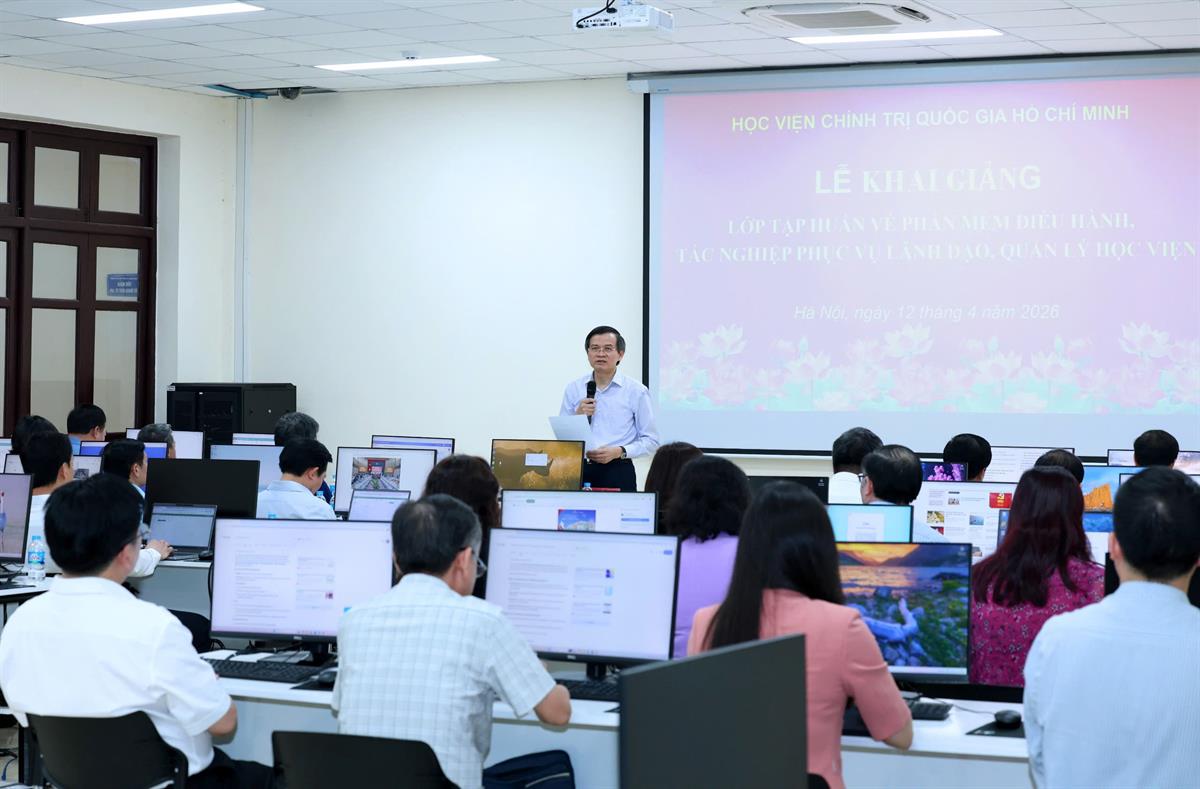 Sáng ngày 11/04/2026, tại Hà Nội, Học viện Chính trị quốc gia Hồ Chí Minh tổ chức khai giảng Lớp tập huấn về phần mềm Điều hành, tác nghiệp phục vụ lãnh đạo, quản lý của Học viện. PGS,TS Lê Hải Bình, Ủy viên Ban Chấp hành Trung ương Đảng, Phó Giám đốc thường trực Học viện dự và chủ trì buổi lễ.