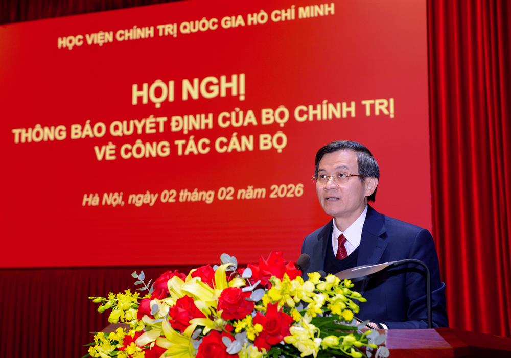 Chiều ngày 02/02/2026, Học viện Chính trị quốc gia Hồ Chí Minh tổ chức Hội nghị thông báo Quyết định của Bộ Chính trị về việc phân công, bổ nhiệm Giám đốc Học viện. Hội nghị được tổ chức theo hình thức trực tiếp kết hợp trực tuyến từ Trung tâm Học viện đến các Học viện trực thuộc II, III, IV.