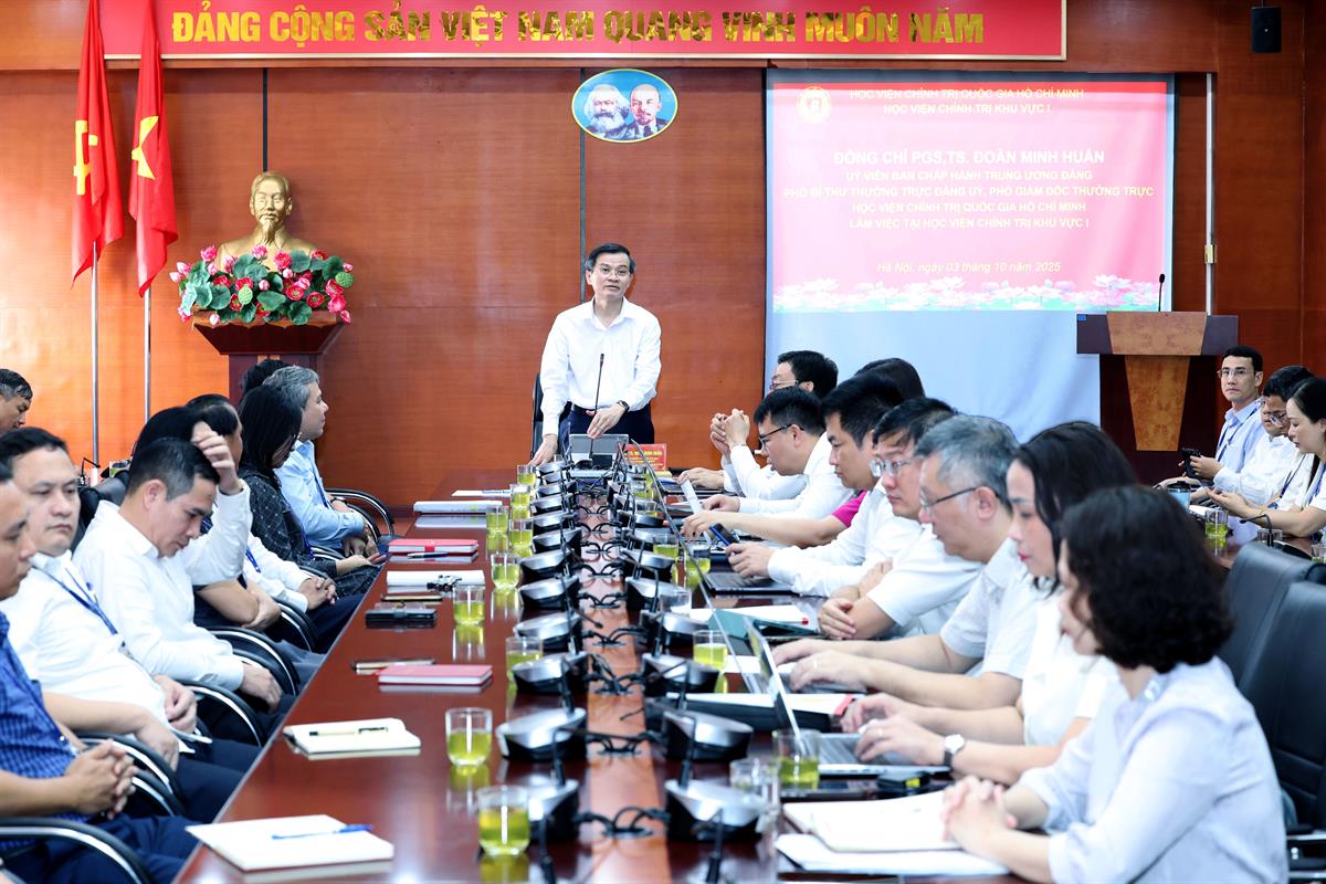 Sáng ngày 3/10/2025, tại Hà Nội, PGS,TS Đoàn Minh Huấn, Ủy viên Trung ương Đảng, Phó Giám đốc thường trực Học viện Chính trị quốc gia Hồ Chí Minh đã chủ trì làm việc với Học viện Chính trị khu vực I. Tham gia Đoàn công tác có đại diện lãnh đạo các đơn vị chức năng trực thuộc Học viện Chính trị quốc gia Hồ Chí Minh.