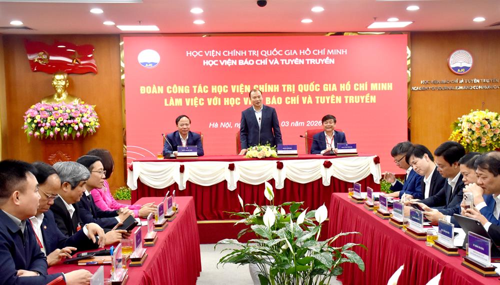Chiều 06/3/2026, đoàn công tác Học viện Chính trị quốc gia Hồ Chí Minh do PGS,TS. Lê Hải Bình, Ủy viên Trung ương Đảng, Phó Giám đốc Thường trực Học viện làm Trưởng đoàn đã có buổi làm việc với cán bộ chủ chốt Học viện Báo chí và Tuyên truyền.