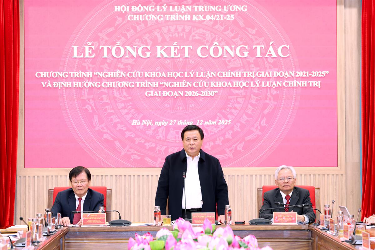 Chiều ngày 27/12/2025, Hội đồng Lý luận Trung ương tổ chức Tổng kết Chương trình “Nghiên cứu khoa học lý luận chính trị giai đoạn 2021-2025" (KX.04/21-25) và định hướng Chương trình “Nghiên cứu khoa học lý luận chính trị giai đoạn 2026-2030”. GS,TS Nguyễn Xuân Thắng, Ủy viên Bộ Chính trị, Giám đốc Học viện Chính trị quốc gia Hồ Chí Minh, Chủ tịch Hội đồng Lý luận Trung ương, Chủ nhiệm Chương trình KX.04/21-25 chủ trì hội nghị.