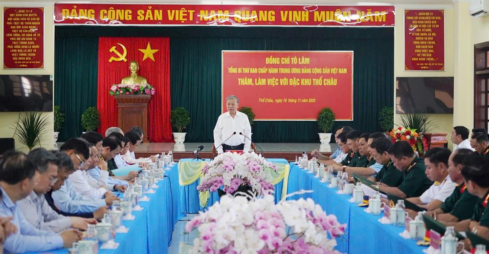 Chiều 19/11, đồng chí Tô Lâm, Tổng Bí thư Ban Chấp hành Trung ương Đảng Cộng sản Việt Nam, Bí thư Quân ủy Trung ương, cùng đoàn công tác của Trung ương đến thăm và làm việc tại đặc khu Thổ Châu (tỉnh An Giang).