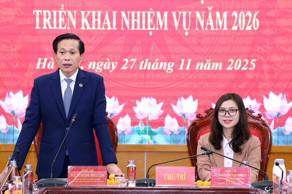 Chiều 27/11/2025 tại Học viện Chính trị quốc gia Hồ Chí Minh, Vụ Các trường chính trị tổ chức Hội nghị tổng kết công tác đảng và các mặt công tác năm 2025, triển khai nhiệm vụ năm 2026. PGS,TS Hoàng Phúc Lâm, Phó Bí thư Đảng ủy, Phó Giám đốc Học viện dự, chủ trì và chỉ đạo hội nghị.