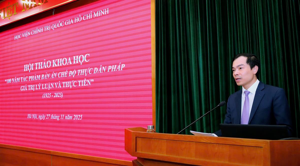 Sáng 27/11, tại Hà Nội, Học viện Chính trị quốc gia Hồ Chí Minh tổ chức Hội thảo khoa học cấp Bộ với chủ đề: “100 năm tác phẩm “Bản án chế độ thực dân Pháp” - Giá trị lý luận và thực tiễn” nhằm kỷ niệm 100 năm ngày tác phẩm quan trọng này ra đời. PGS,TS Nguyễn Mạnh Hùng, Phó Giám đốc Học viện Chính trị quốc gia Hồ Chí Minh, Phó Chủ tịch Hội đồng Lý luận Trung ương dự và chủ trì hội thảo.