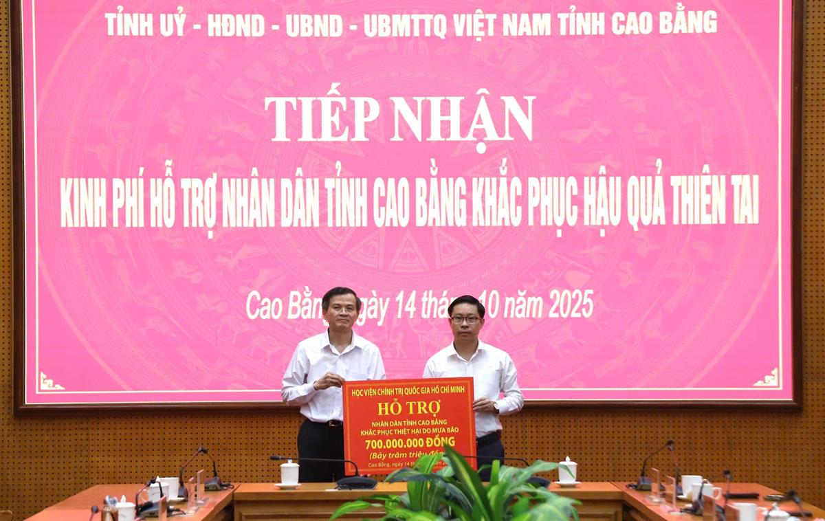 Sáng ngày 14/10/2025, Đoàn công tác của Học viện Chính trị quốc gia Hồ Chí Minh do đồng chí Đoàn Minh Huấn, Ủy viên Ban Chấp hành Trung ương Đảng, Phó Giám đốc Thường trực Học viện làm Trưởng đoàn đã đến thăm, động viên và trao hỗ trợ 1 tỷ đồng giúp Đảng bộ, chính quyền và Nhân dân tỉnh Thái Nguyên khắc phục hậu quả thiên tai.