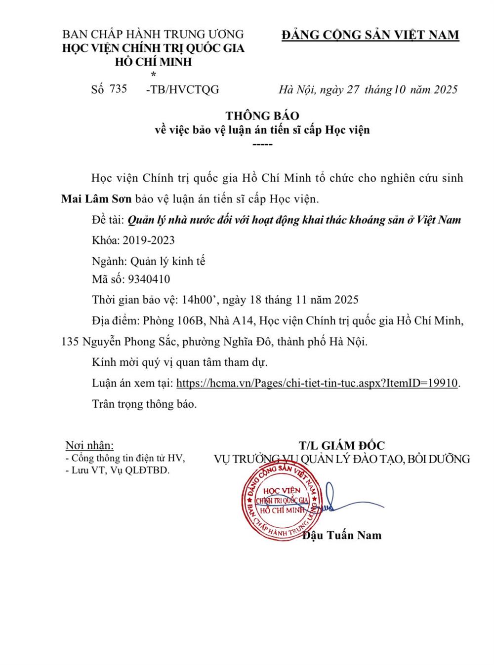 Thông báo tổ chức bảo vệ luận án tiến sĩ cho Nghiên cứu sinh Mai Lâm Sơn