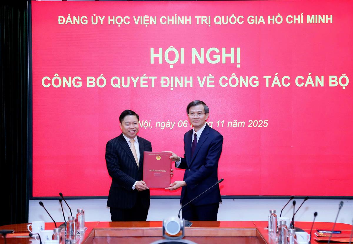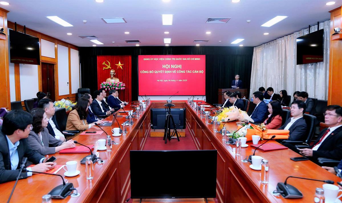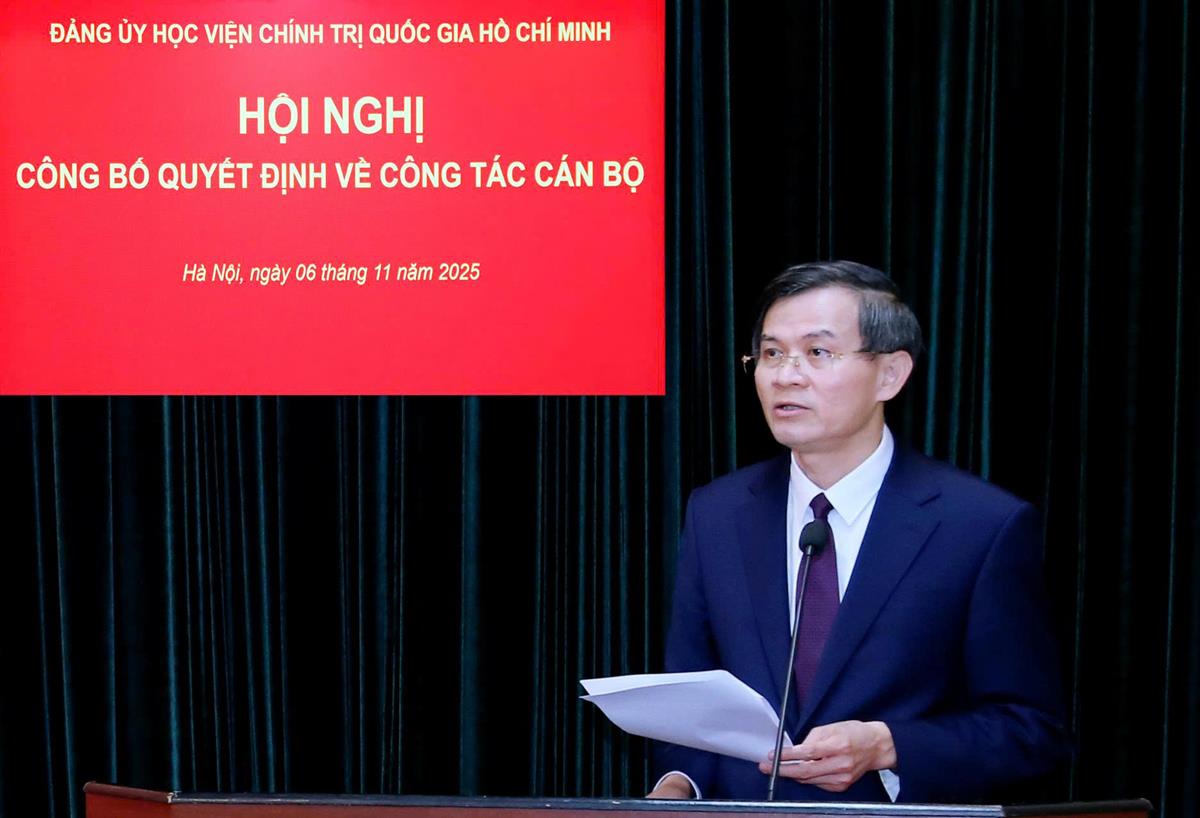 Chiều ngày 6/11/2025, tại Hà Nội, Đảng uỷ Học viện Chính trị quốc gia Hồ Chí Minh tổ chức Hội nghị công bố quyết định về công tác cán bộ. GS,TS Nguyễn Xuân Thắng, Uỷ viên Bộ Chính trị, Giám đốc Học viện, Chủ tịch Hội đồng Lý luận Trung ương phụ trách Đảng bộ Học viện tham dự Hội nghị.