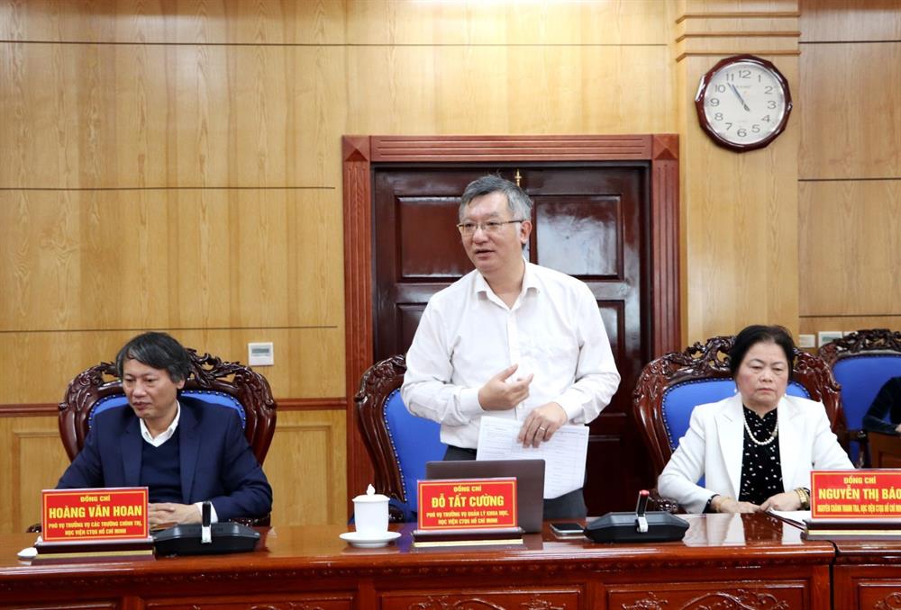Đồng chí Phó Giám đốc Học viện đề nghị, Tỉnh ủy Lai Châu tiếp tục trực tiếp lãnh, chỉ đạo trong đẩy mạnh công tác đào tạo, bồi dưỡng cán bộ đáp ứng yêu cầu nhiệm vụ trong tình hình mới, góp phần thực hiện thắng lợi nhiệm vụ chính trị của địa phương; thực hiện tốt việc xây dựng kế hoạch đào tạo, bồi dưỡng gắn với quy hoạch, bố trí, sử dụng cán bộ; quyết tâm xây dựng Trường Chính trị tỉnh Lai Châu đạt Chuẩn mức 1 vào năm 2026 và tích cực phấn đấu Chuẩn mức 2 sớm hơn so với dự kiến; quan tâm đào tạo, bồi dưỡng nâng cao trình độ, kỹ năng nghiệp vụ, nghiên cứu khoa học cho đội ngũ giảng viên Trường Chính trị tỉnh; đẩy mạnh thực hiện nhiệm vụ nghiên cứu khoa học...