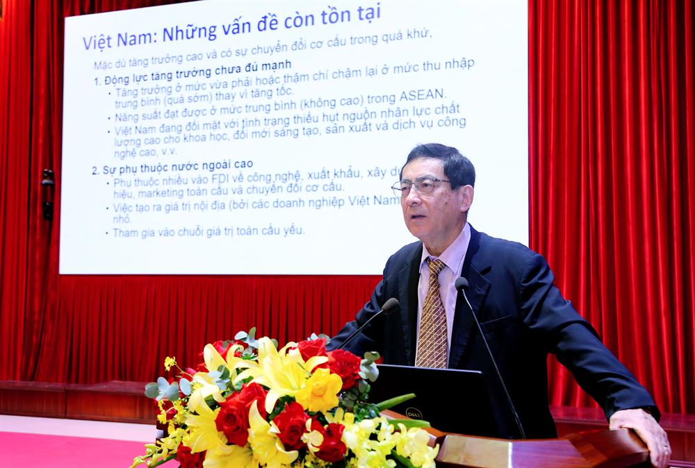 Trình bày chuyên đề “Việt Nam: Cần áp dụng phương pháp chính sách mới – Hướng tới tăng trưởng hai chữ số và thu nhập cao vào năm 2045” tại chương trình, GS Ohno Kenichi nhấn mạnh, mặc dù Việt Nam đã đạt được nhiều thành tựu quan trọng trong quá khứ, song năng lực công nghiệp hiện nay vẫn chưa đủ mạnh để đưa đất nước bước vào nhóm quốc gia có thu nhập cao và trình độ công nghệ tiên tiến.