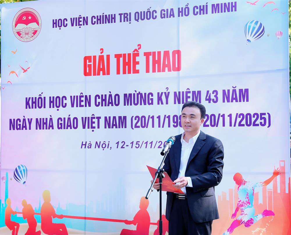 Phát biểu tại Lễ khai mạc, TS Trương Công Đắc, Phó Bí thư chuyên trách Đảng ủy Học viện Chính trị quốc gia Hồ Chí Minh nhấn mạnh, Giải thể thao khối học viên chào mừng kỷ niệm 43 năm Ngày Nhà giáo Việt Nam 20/11/1982-20/11/2025 không chỉ là hoạt động thể dục, thể thao thông thường mà còn mang ý nghĩa sâu sắc, là lời tri ân chân thành của học viên đối với các thầy giáo, cô giáo của Học viện; là minh chứng cho tinh thần rèn luyện thân thể, nâng cao sức khỏe, phát huy lối sống năng động, lành mạnh trong môi trường học tập và nghiên cứu.