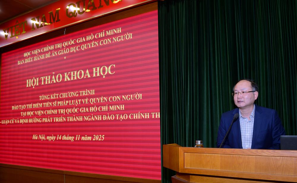 Đồng chí Phó Giám đốc Học viện cho biết, với vai trò cơ quan thường trực, Học viện Chính trị quốc gia Hồ Chí Minh đã chủ động và tích cực triển khai nhiều nhiệm vụ quan trọng, nhất là việc xây dựng và tổ chức đào tạo thí điểm Chương trình Tiến sĩ Pháp luật về quyền con người từ năm 2021. Sau bốn năm thực hiện, việc tổng kết Chương trình là yêu cầu cấp thiết nhằm đánh giá toàn diện kết quả đạt được, chỉ rõ những hạn chế còn tồn tại và đề xuất các giải pháp nâng cao chất lượng đào tạo khi Bộ Giáo dục và Đào tạo đã cấp mã ngành chính thức.