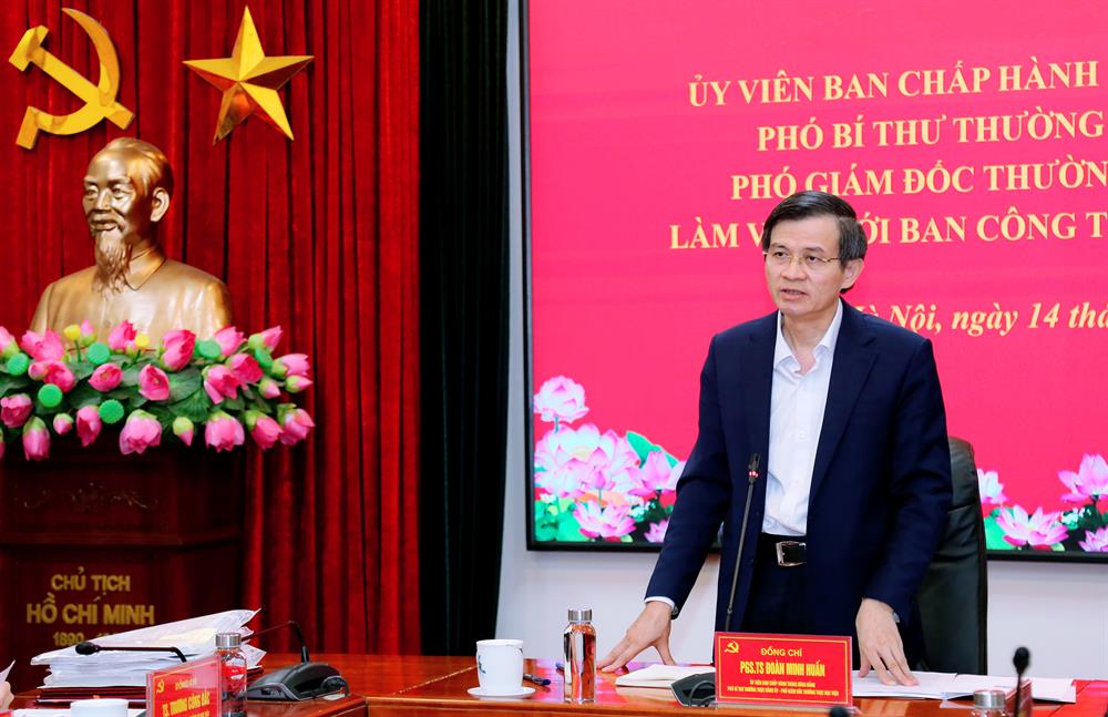 Phát biểu kết luận tại buổi làm việc, PGS,TS Đoàn Minh Huấn, Ủy viên Trung ương Đảng, Phó Bí thư thường trực Đảng uỷ, Phó Giám đốc thường trực Học viện ghi nhận và đánh giá cao những cố gắng, nỗ lực, đóng góp, trách nhiệm của Ban Công tác Đảng – Đoàn thể trong thời gian qua, bảo đảm sự lãnh đạo, chỉ đạo trực tiếp, toàn diện của Đảng uỷ, trực tiếp là Thường trực, Ban Thường vụ Đảng uỷ Học viện và sự quản lý, điều hành của Ban Giám đốc Học viện trong công tác đảng, đoàn thể.