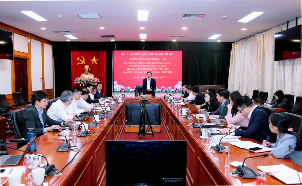 Chiều ngày 14/11/2025, tại Hà Nội, PGS,TS Đoàn Minh Huấn, Uỷ viên Trung ương Đảng, Phó Bí thư thường trực Đảng uỷ, Phó Giám đốc thường trực Học viện Chính trị quốc gia Hồ Chí Minh chủ trì làm việc với Ban Công tác Đảng – Đoàn thể về kết quả công tác 5 năm 2020-2025 và phương hướng, nhiệm vụ công tác giai đoạn 2025-2030.