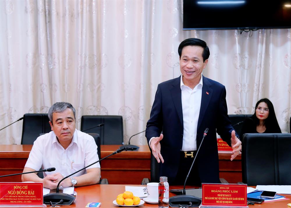 Đại biểu dự họp, về phía Học viện Chính trị quốc gia Hồ Chí Minh và các ban, bộ, ngành Trung ương có các đồng chí: PGS,TS Hoàng Phúc Lâm, Phó Giám đốc Học viện Chính trị quốc gia Hồ Chí Minh, Phó Chủ tịch Hội đồng; Ngô Đông Hải, Phó Trưởng Ban Tuyên giáo và Dân vận Trung ương; Vũ Thanh Sơn, Cục trưởng Cục Đào tạo, bồi dưỡng cán bộ, Ban Tổ chức Trung ương; các thành viên Uỷ viên Hội đồng thẩm định; thủ trưởng các đơn vị trực thuộc Học viện: Vụ Quản lý khoa học, Vụ Các trường chính trị, Vụ Tổ chức, cán bộ, Ban Thanh tra Học viện.