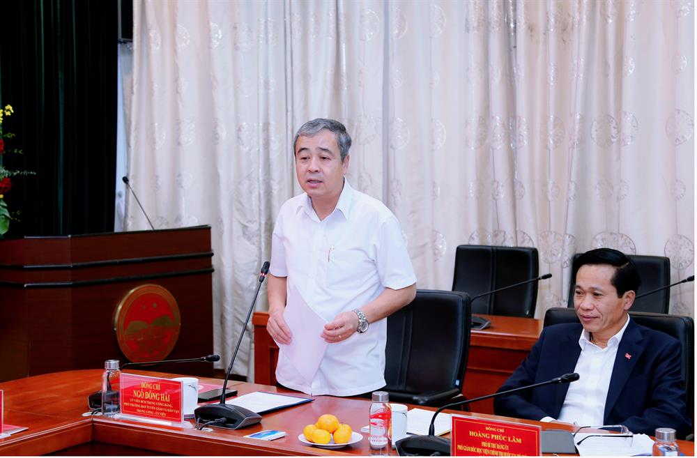 Với vị thế là trường chính trị của Thủ đô, đồng chí Ủy viên Bộ Chính trị, Giám đốc Học viện, Chủ tịch Hội đồng Lý luận Trung ương đề nghị Nhà trường chủ động xây dựng các đề án phát triển phù hợp, có tầm nhìn dài hạn. Việc xây dựng văn hóa trường Đảng phải gắn với tinh thần của Kết luận số 210-KL/TW của Bộ Chính trị “về tiếp tục xây dựng, hoàn thiện tổ chức bộ máy của hệ thống chính trị trong thời gian tới”; đồng thời, trong điều kiện đặc thù của Hà Nội, cần nghiên cứu mô hình bố trí, sử dụng cơ sở vật chất một cách linh hoạt, hiệu quả, có thể phối hợp, tận dụng cơ sở vật chất của chính quyền địa phương hai cấp nhằm phục vụ tốt nhất cho nhiệm vụ đào tạo, bồi dưỡng cán bộ.