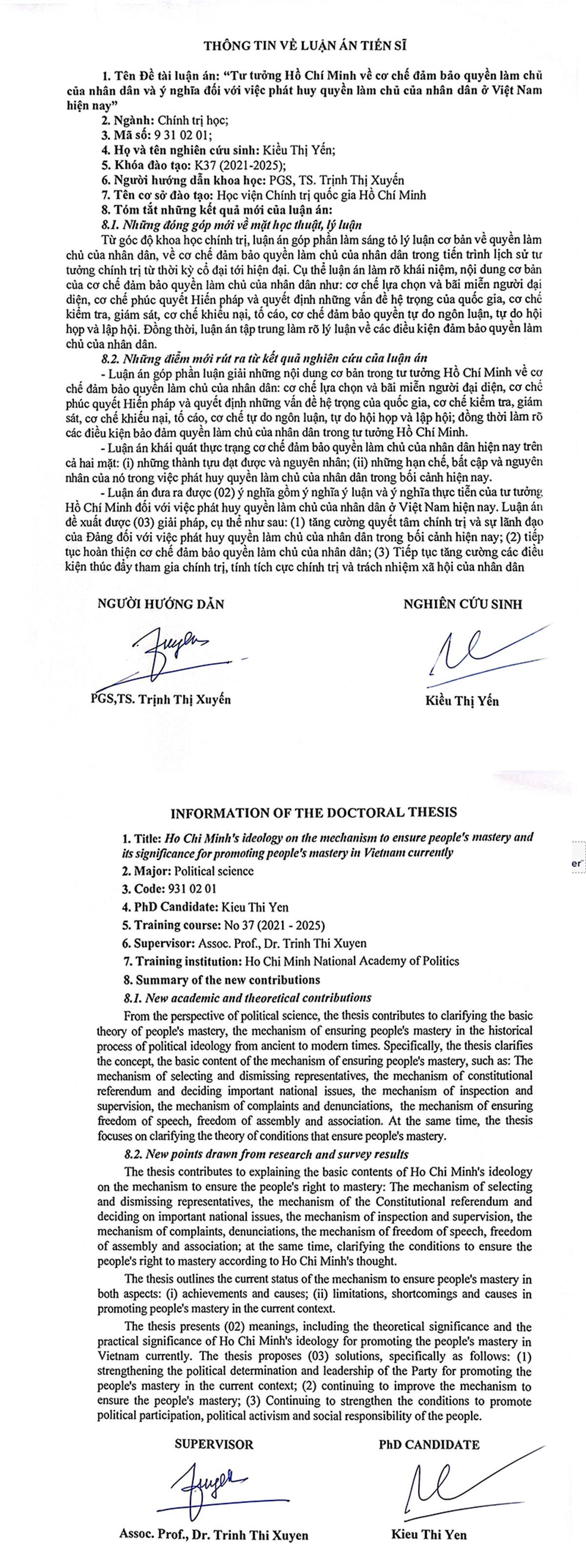Luận án và tóm tắt luận án của Nghiên cứu sinh Dương Thị Hậu sau bảo vệ cấp Học viện