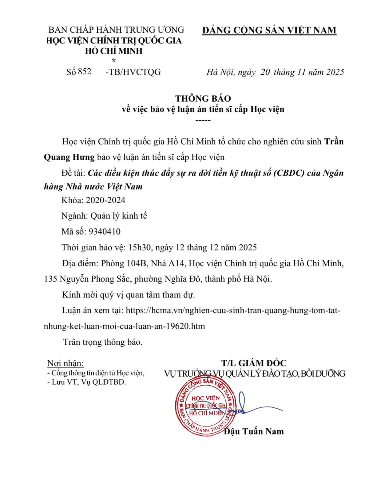 Thông báo tổ chức bảo vệ luận án tiến sĩ cho Nghiên cứu sinh Trần Quang Hưng