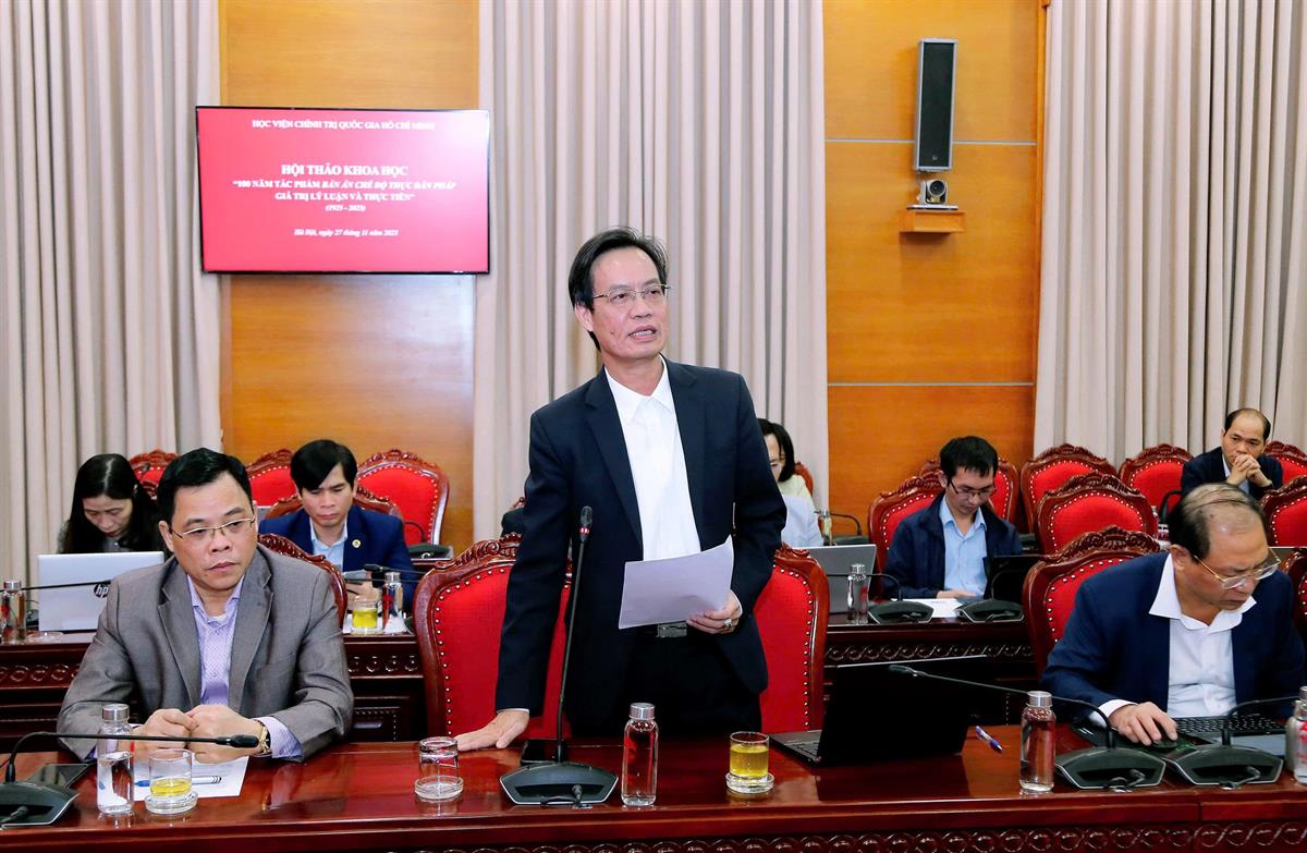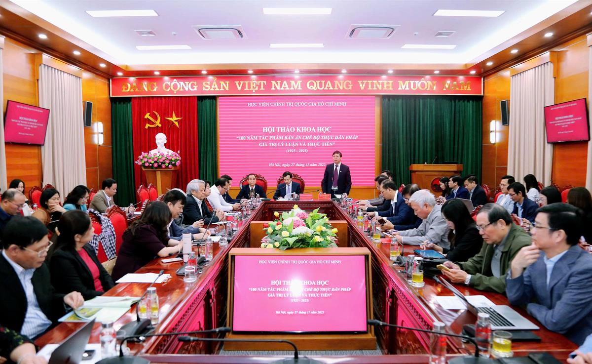 Sáng 27/11, tại Hà Nội, Học viện Chính trị quốc gia Hồ Chí Minh tổ chức Hội thảo khoa học cấp Bộ với chủ đề: “100 năm tác phẩm “Bản án chế độ thực dân Pháp” - Giá trị lý luận và thực tiễn” nhằm kỷ niệm 100 năm ngày tác phẩm quan trọng này ra đời. PGS,TS Nguyễn Mạnh Hùng, Phó Giám đốc Học viện Chính trị quốc gia Hồ Chí Minh, Phó Chủ tịch Hội đồng Lý luận Trung ương dự và chủ trì hội thảo.