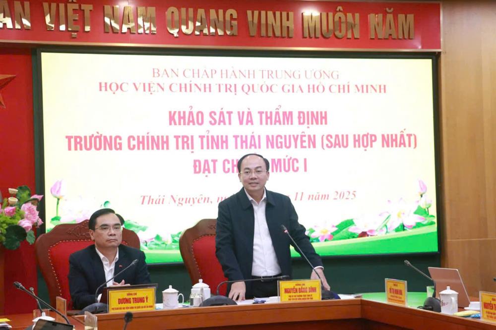 Chiều 28/11/2025, Đoàn công tác của Học viện Chính trị quốc gia Hồ Chí Minh do PGS.TS Dương Trung Ý, Phó Giám đốc Học viện làm Trưởng đoàn đã đến khảo sát, thẩm định Trường Chính trị tỉnh Thái Nguyên nhằm đánh giá mức độ đáp ứng các tiêu chí trường chính trị chuẩn theo Quy định số 11-QĐ/TW ngày 19/5/2021 của Ban Bí thư về trường chính trị chuẩn và các hướng dẫn triển khai của Học viện.