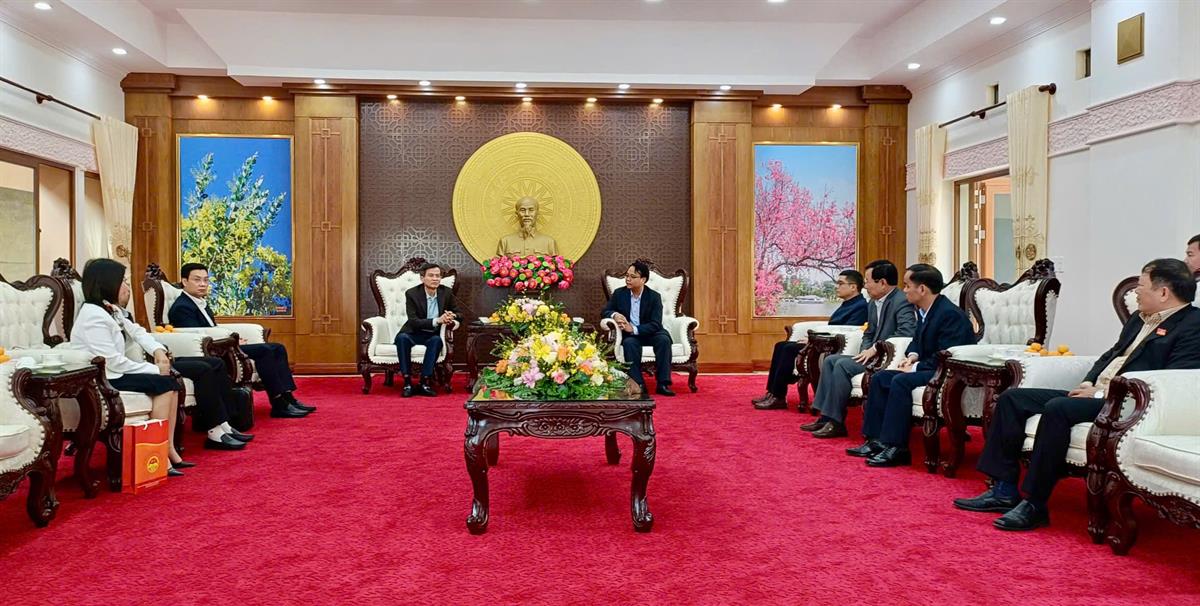 Đồng chí Đặng Hồng Sỹ, Phó Bí thư Thường trực Tỉnh ủy và lãnh đạo các ban, ngành của tỉnh tiếp đoàn
