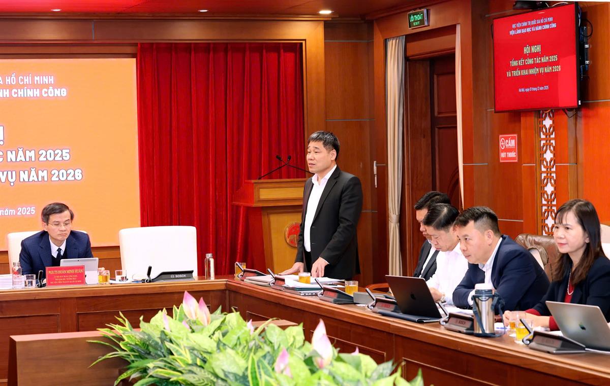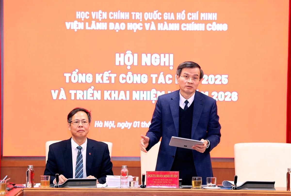 Trên cơ sở các báo cáo của Viện Lãnh đạo học và Hành chính công, cùng các ý kiến chia sẻ, trao đổi tại hội nghị, PGS,TS Đoàn Minh Huấn, Ủy viên Trung ương Đảng, Phó Bí thư thường trực Đảng ủy, Phó Giám đốc thường trực Học viện đã ghi nhận và đánh giá cao tinh thần trách nhiệm, sự tận tụy và nỗ lực không ngừng của đội ngũ cán bộ, giảng viên trong quá trình xây dựng và phát triển đơn vị. Đồng chí khẳng định rằng, những kết quả đạt được trong năm 2025 là minh chứng cho sự đoàn kết, thống nhất, tinh thần chủ động đổi mới và sự nỗ lực vượt khó của tập thể Viện, đặc biệt trong bối cảnh có nhiều nhiệm vụ mới, yêu cầu cao và áp lực lớn từ sự thay đổi về cơ cấu tổ chức.