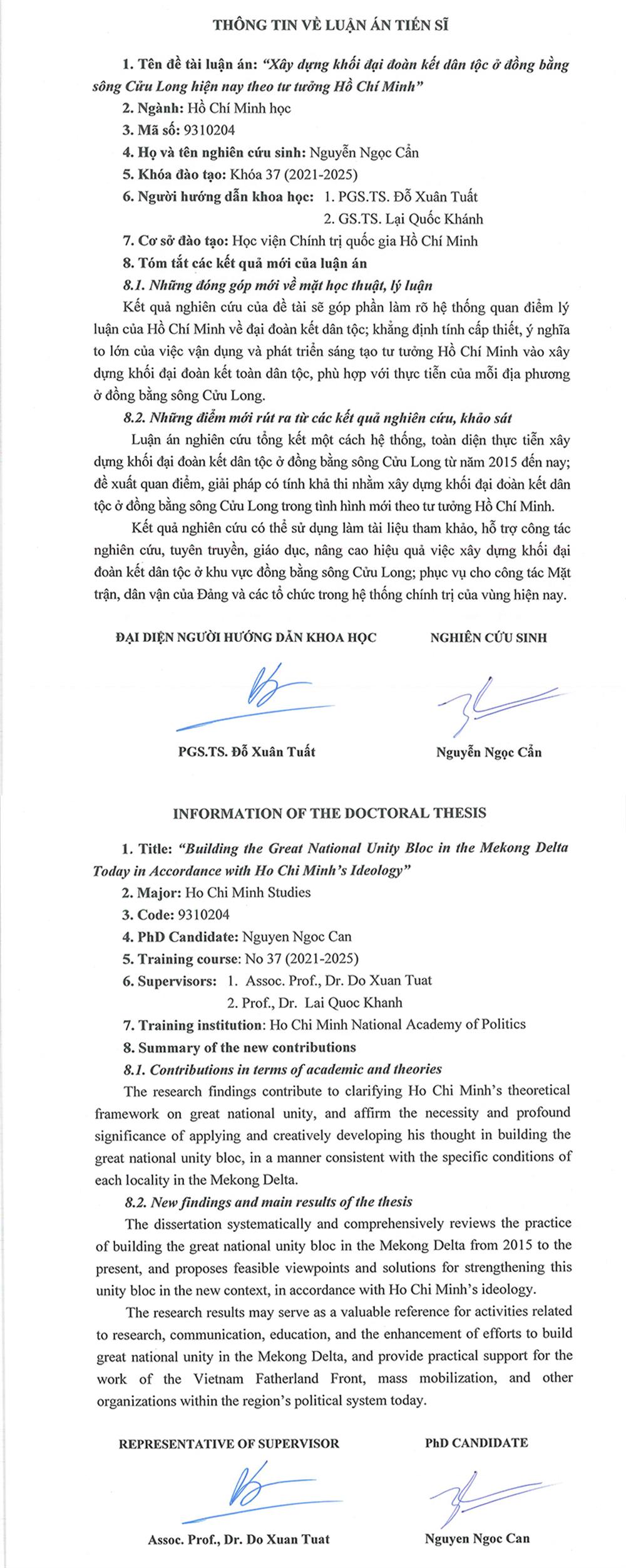 Nghiên cứu sinh Nguyển Ngọc Cẩn tóm tắt những kết luận mới của luận án