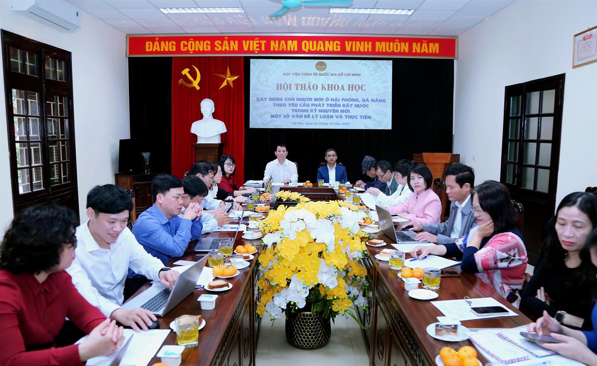 Sáng ngày 3/12/2025, tại Hà Nội, Học viện Chính trị quốc gia Hồ Chí Minh tổ chức hội thảo khoa học “Xây dựng con người mới ở Hải Phòng, Đà Nẵng theo yêu cầu phát triển đất nước trong kỷ nguyên mới - Một số vấn đề lý luận và thực tiễn”. TS Nguyễn Văn Quyết, Phó Viện trưởng Viện Chủ nghĩa xã hội khoa học thuộc Học viện Chính trị quốc gia Hồ Chí Minh; TS Nguyễn Anh Tuấn, Phó Viện trưởng Viện Chủ nghĩa xã hội khoa học thuộc Học viện Chính trị quốc gia Hồ Chí Minh đồng chủ trì hội thảo.