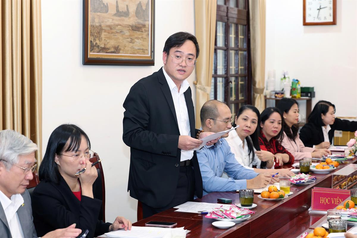 Tại hội nghị, các cán bộ, giảng viên của Viện đã tích cực đóng góp ý kiến vào dự thảo báo cáo tổng kết và các hoạt động của đơn vị, đồng thời đề xuất những kiến nghị nhằm nâng cao chất lượng công tác và xây dựng đơn vị ngày càng vững mạnh trong thời gian tới. Hội nghị cũng ghi nhận các ý kiến chia sẻ, trao đổi, tham góp từ đại diện Đảng ủy Học viện, đại diện lãnh đạo các đơn vị chức năng, qua đó giúp Viện Văn hóa và Phát triển tiếp tục hoàn thiện phương hướng và nhiệm vụ trọng tâm năm 2026.