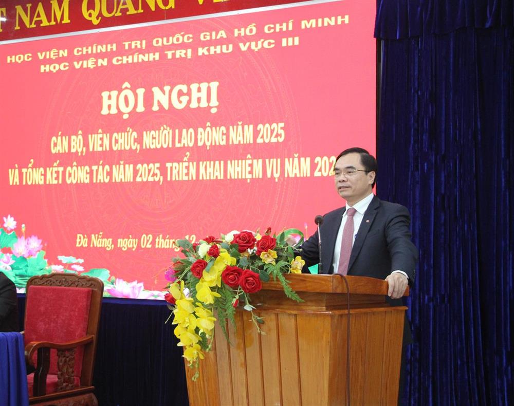 Phát biểu chỉ đạo Hội nghị, PGS,TS Dương Trung Ý ghi nhận, biểu dương và chúc mừng những thành tích mà Học viện chính trị khu vực III đã đạt được của Học viện III đã đạt được năm 2025, đồng thời yêu cầu phát huy kết quả đã đạt được và khắc phục những hạn chế, khó khăn trong năm 2026. Gắn với bối cảnh tình hình, nhiệm vụ xây dựng và phát triển Học viện trong tình hình mới, PGS,TS Dương Trung Ý đề nghị Học viện III quan tâm, thực hiện tốt một số yêu cầu nhiệm vụ: Nhận thức đúng, đầy đủ hơn nữa về vị trí, vai trò của Học viện Chính trị khu vực III; tiếp tục đổi mới, nâng cao hơn nữa chất lượng, hiệu quả công tác đào tạo, bồi dưỡng cán bộ; tiếp tục đổi mới, nâng cao chất lượng, hiệu quả công tác trên tất cả các mặt công tác; chú trọng xây dựng Học viện chuẩn, Học viện thông minh theo hướng: Chuẩn về thể chế, chuẩn về tổ chức bộ máy, chuẩn về nội dung chương trình; phương pháp đào tạo, chuẩn về đội ngũ, chuẩn về cơ sở vật chất, chuẩn về văn hóa Trường Đảng… tiến tới đẩy mạnh chuyển đổi số, triển khai mô hình Học viện thông minh: xây dựng Học viện III thông minh, văn minh, hiện đại.