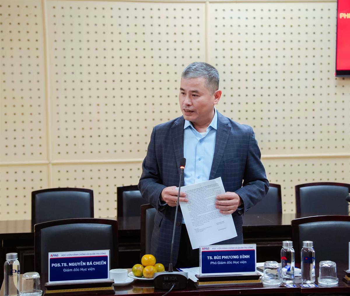 TS Bùi Phương Đình, Phó Giám đốc Học viện, Phó Trưởng Ban Thường trực Ban Chỉ đạo 35 Học viện Hành chính và Quản trị công báo cáo kết quả