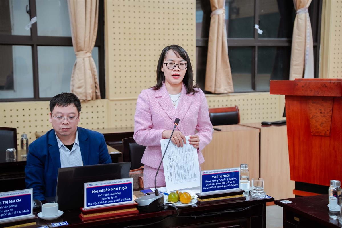 TS Lê Thị Chiên, Phó Vụ trưởng Vụ quản lý khoa học, Chánh Văn phòng Ban Chỉ đạo 35 Học viện Chính trị quốc gia Hồ Chí Minh phát biểu tại Hội nghị