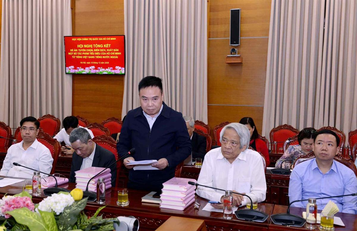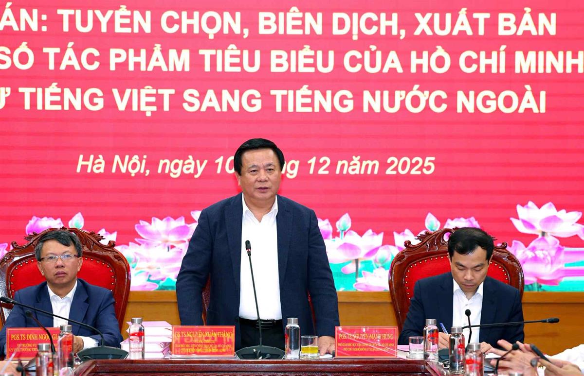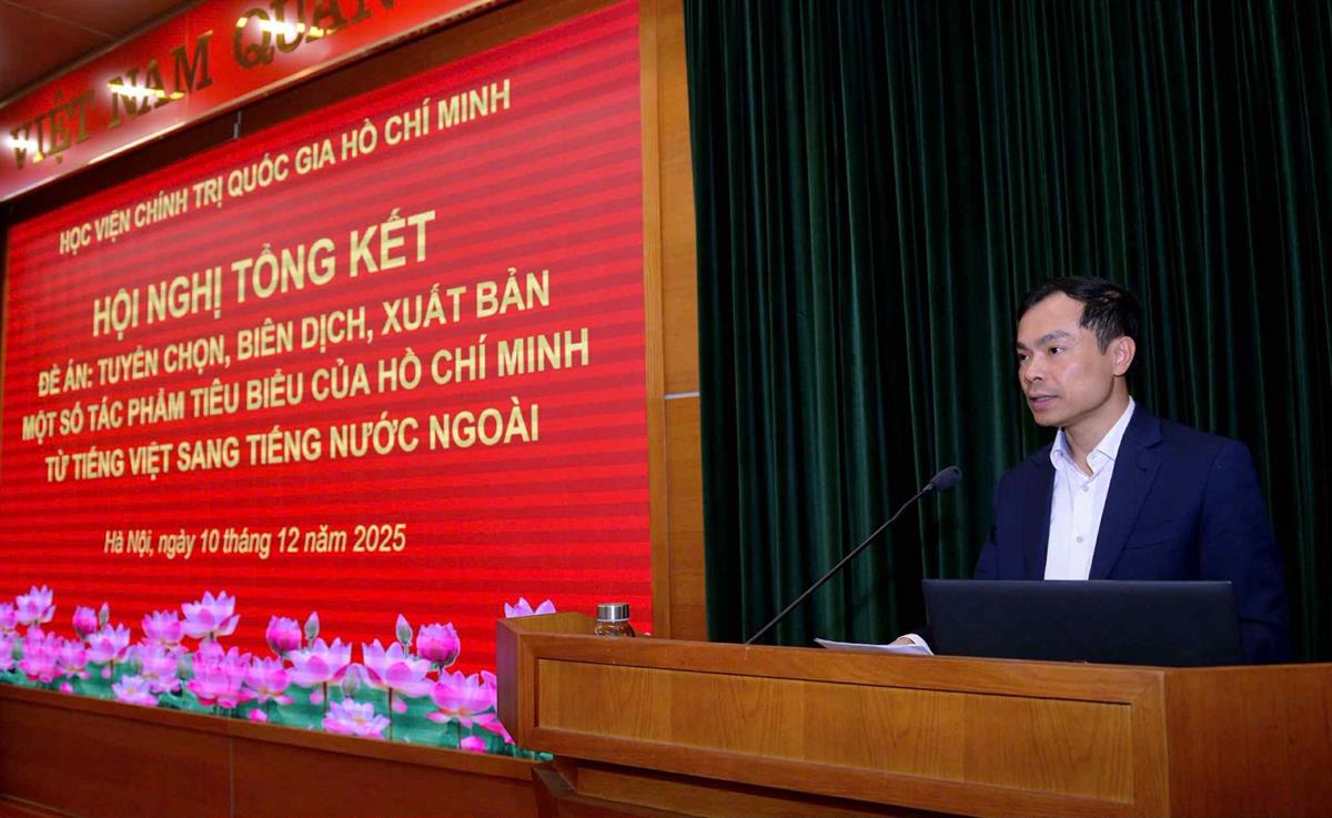 Chiều ngày 10/12/2025, tại Hà Nội, Học viện Chính trị quốc gia Hồ Chí Minh tổ chức Hội nghị Tổng kết Đề án: Tuyển chọn, biên dịch, xuất bản một số tác phẩm tiêu biểu của Hồ Chí Minh từ tiếng Việt sang tiếng nước ngoài. GS,TS Nguyễn Xuân Thắng, Uỷ viên Bộ Chính trị, Giám đốc Học viện Chính trị quốc gia Hồ Chí Minh, Chủ tịch Hội đồng Lý luận Trung ương, Chủ nhiệm Đề án chủ trì và phát biểu chỉ đạo Hội nghị.