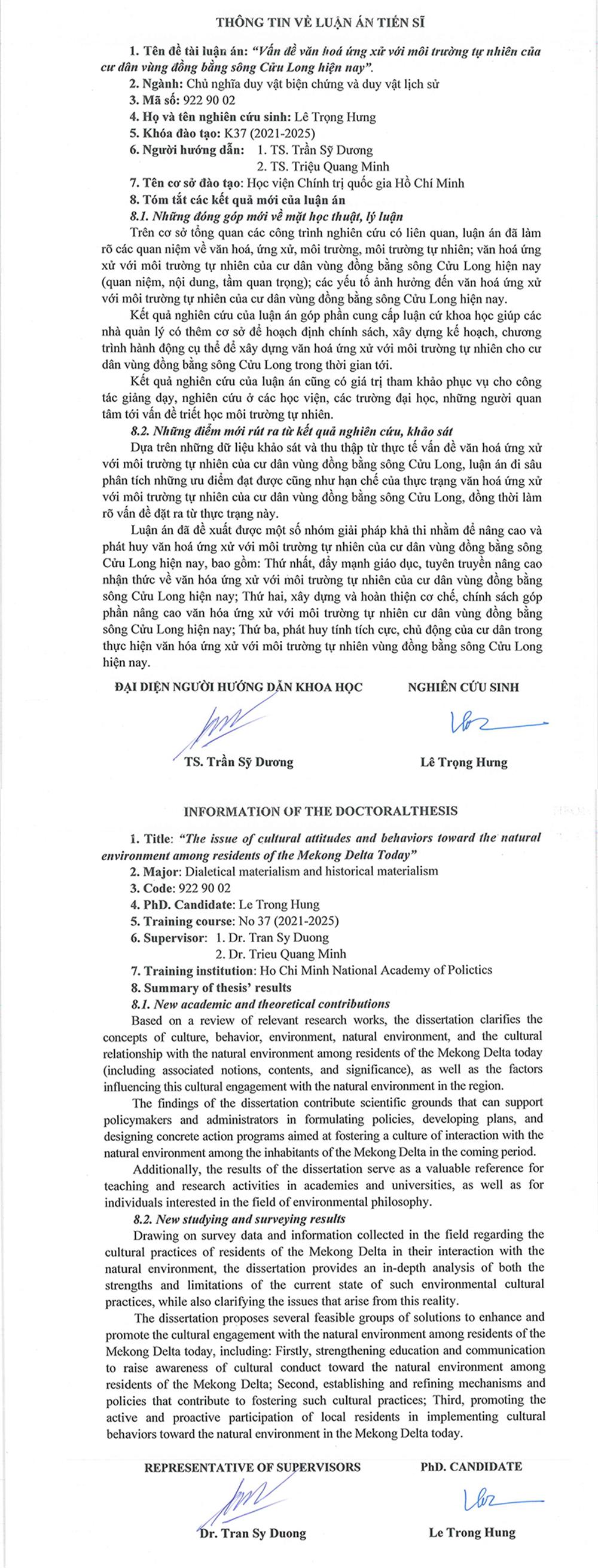 Luận án và tóm tắt luận án của Nghiên cứu sinh Nguyễn Thị Hồng Nhung sau bảo vệ cấp Học viện