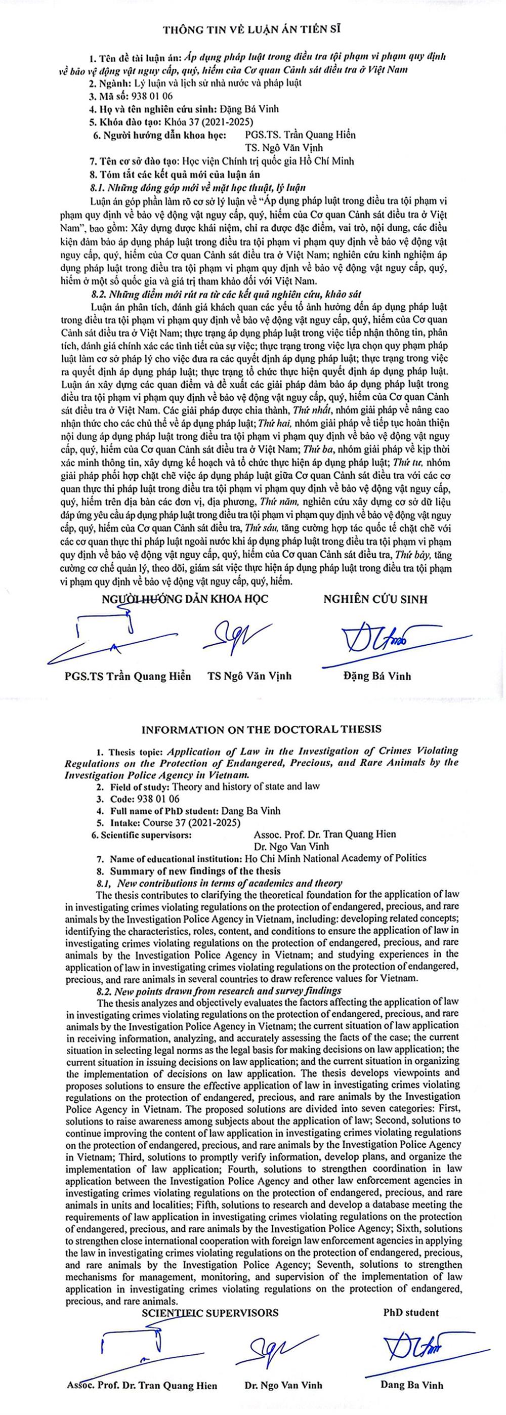 Nghiên cứu sinh Đặng Bá Vinh tóm tắt những kết luận mới của luận án