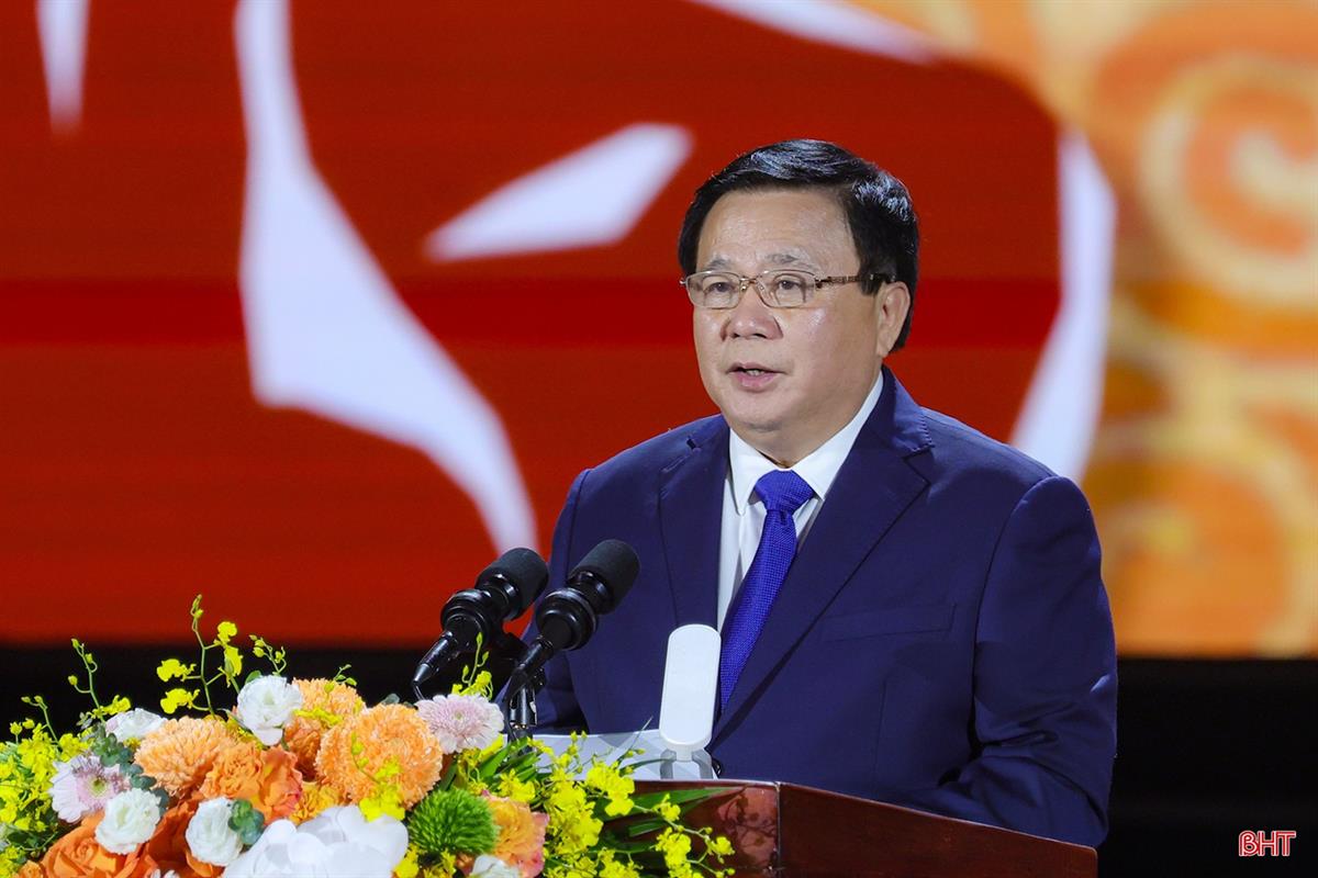 Đồng chí Bí thư Tỉnh ủy khẳng định, tiếp nối truyền thống vẻ vang của quê hương Đại thi hào Nguyễn Du cùng các bậc danh nhân văn hóa, lãnh tụ cách mạng, Đảng bộ và Nhân dân Hà Tĩnh luôn nêu cao tinh thần trách nhiệm, đoàn kết, nỗ lực, vượt qua khó khăn, đạt được kết quả toàn diện trên các lĩnh vực. Công tác xây dựng Đảng, hệ thống chính trị đạt nhiều dấu ấn quan trọng; kinh tế, xã hội chuyển biến rõ nét; an sinh xã hội được bảo đảm, đời sống của Nhân dân ngày càng được nâng cao. Quốc phòng - an ninh và đối ngoại được tăng cường.