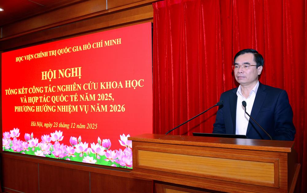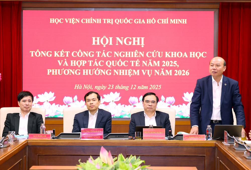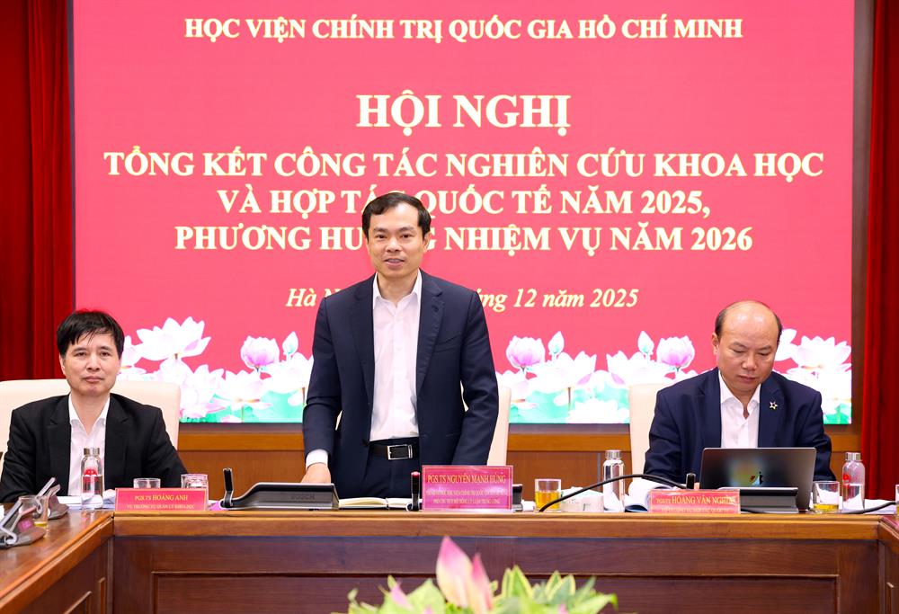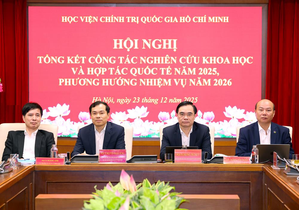 Sáng ngày 23/12/2025, Học viện Chính trị quốc gia Hồ Chí Minh tổ chức Hội nghị tổng kết công tác khoa học và hợp tác quốc tế năm 2025, phương hướng nhiệm vụ 2026. PGS,TS Dương Trung Ý, Phó Giám đốc Học viện và PGS,TS Nguyễn Mạnh Hùng, Phó Giám đốc Học viện, Phó Chủ tịch Hội đồng Lý luận Trung ương dự, chủ trì hội nghị.