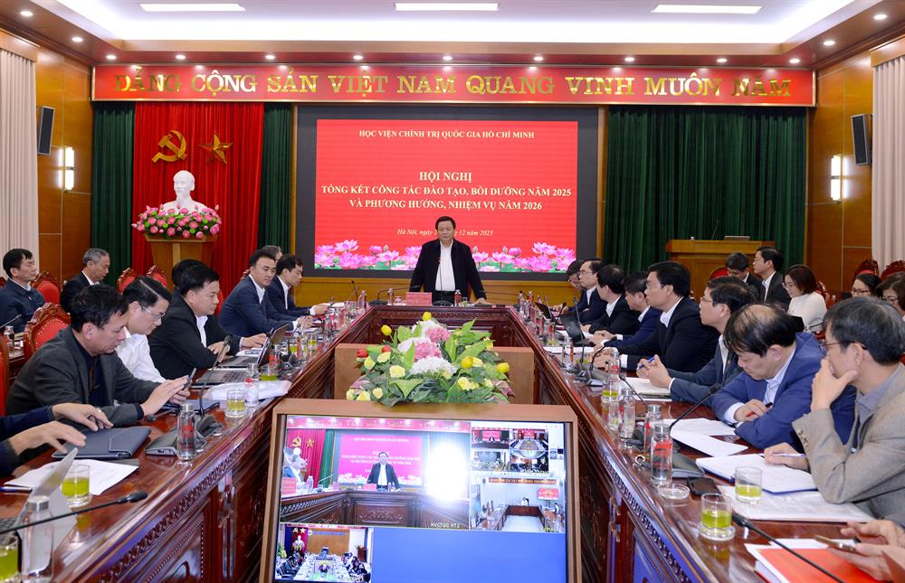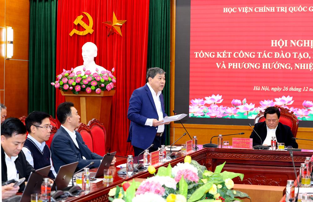 Ngày 26/12/2025, tại Hà Nội, Học viện Chính trị quốc gia Hồ Chí Minh tổ chức Hội nghị Tổng kết công tác đào tạo, bồi dưỡng năm 2025, phương hướng, nhiệm vụ năm 2026. GS,TS Nguyễn Xuân Thắng, Ủy viên Bộ Chính trị, Giám đốc Học viện, Chủ tịch Hội đồng Lý luận Trung ương dự và chủ trì Hội nghị.