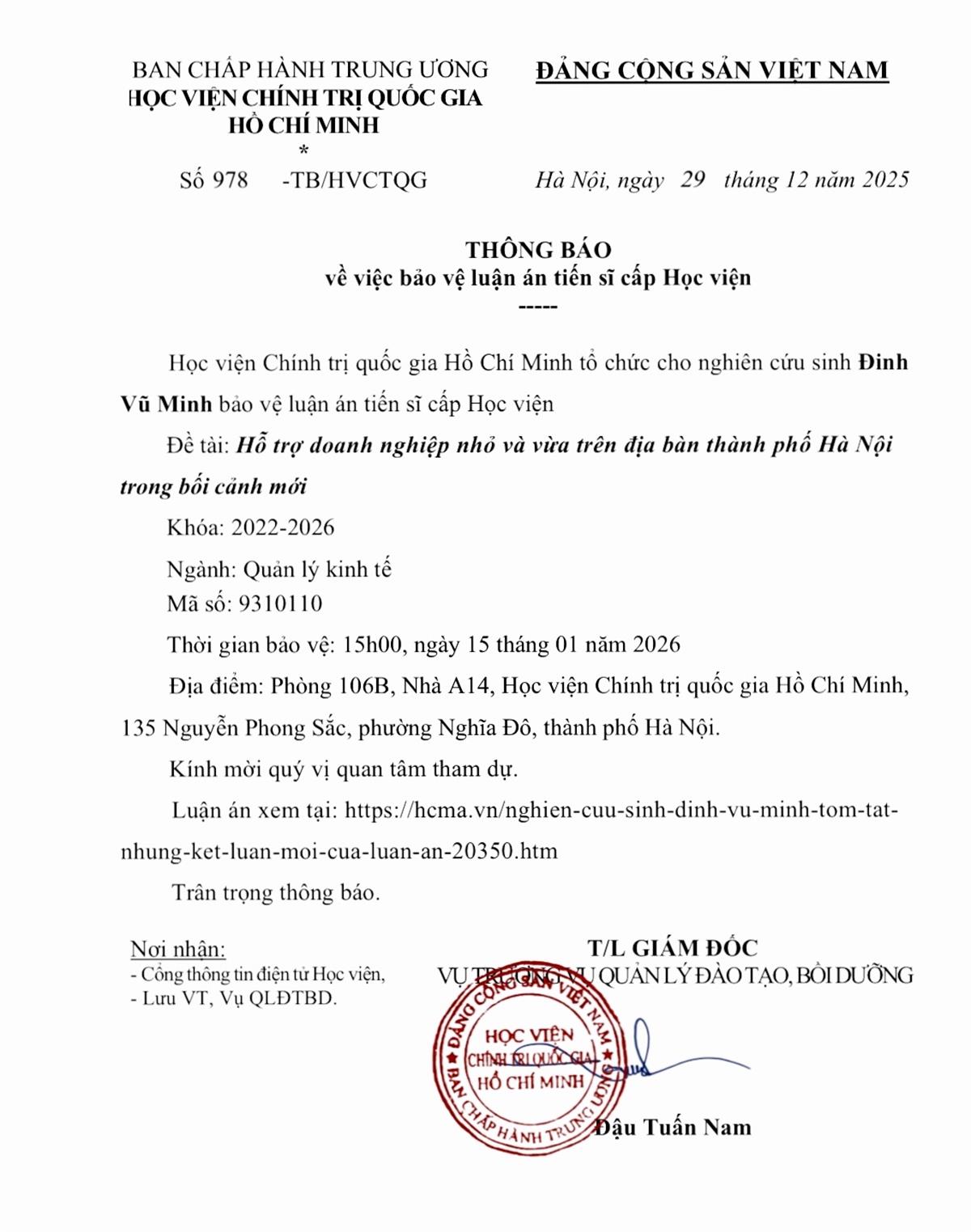 Thông báo tổ chức bảo vệ luận án tiến sĩ cho Nghiên cứu sinh Đinh Vũ Minh