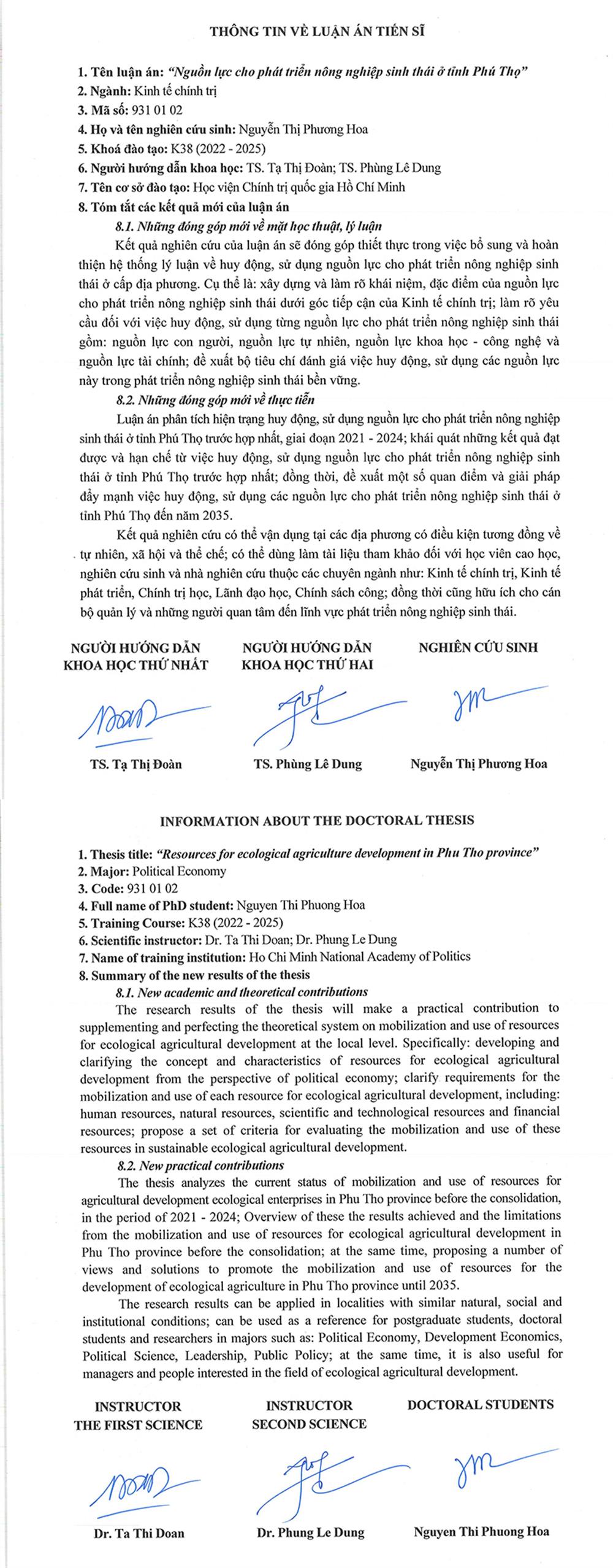 Luận án và tóm tắt luận án của Nghiên cứu sinh Hoàng Thị Thuý sau bảo vệ cấp Học viện