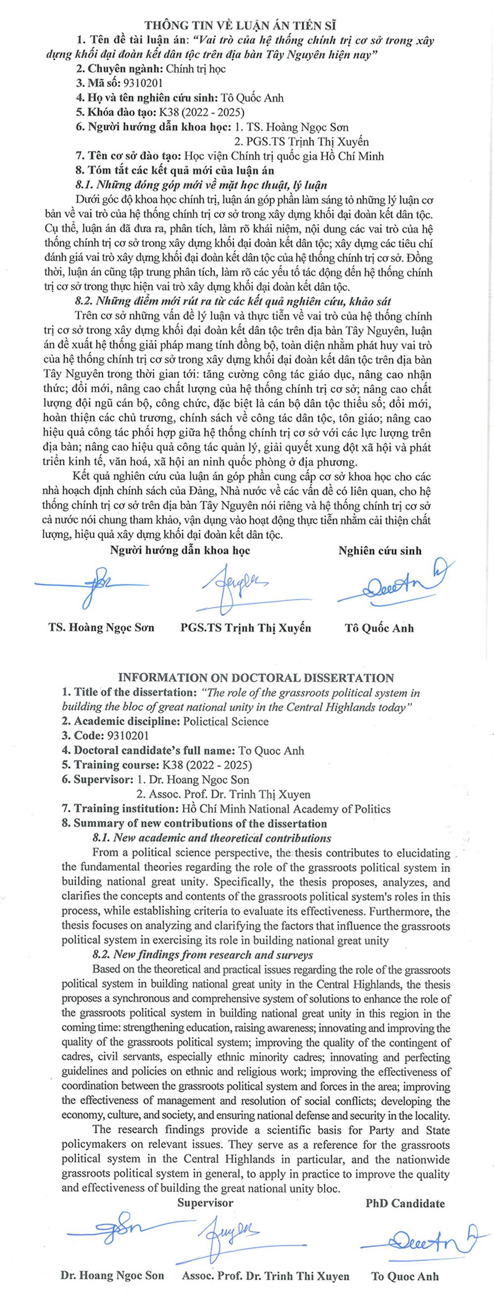 Nghiên cứu sinh Tô Quốc Anh tóm tắt những kết luận mới của luận án