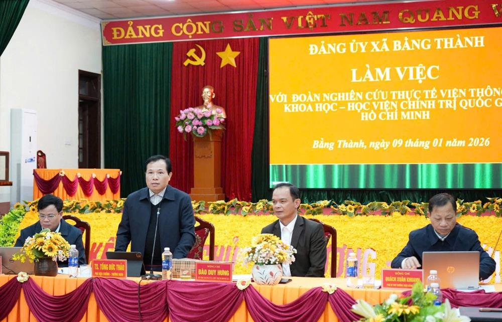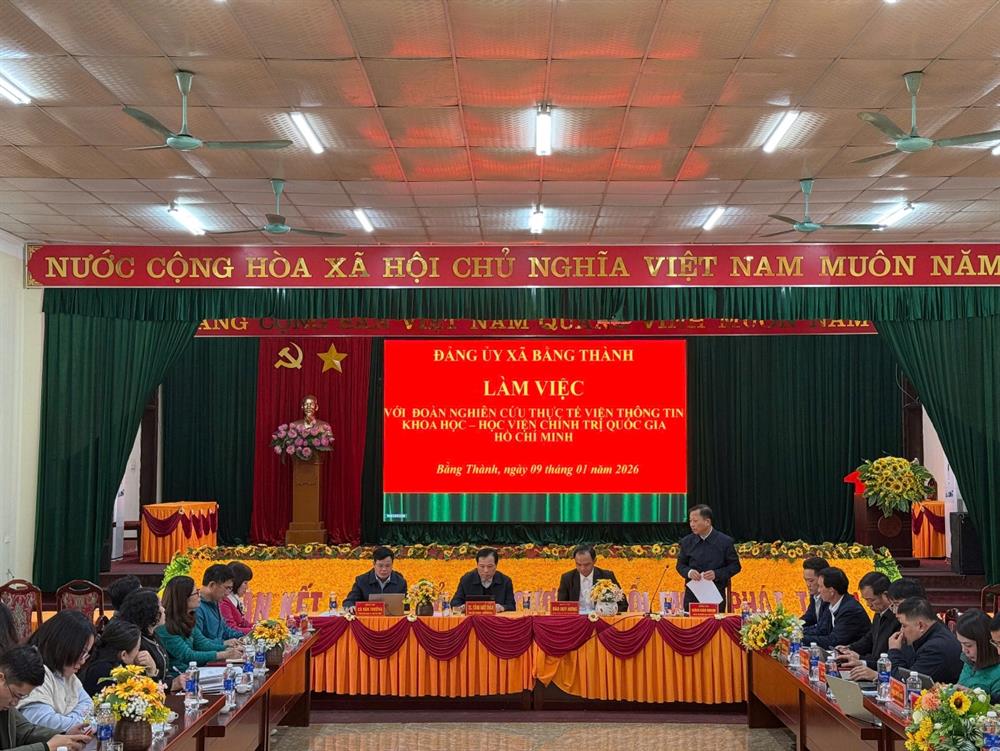 Thực hiện nhiệm vụ biên soạn cuốn sách thuộc Tủ sách phục vụ lãnh đạo “Nâng cao hiệu quả vận hành của chính quyền địa phương hai cấp: từ kinh nghiệm quốc tế đến thực tiễn Việt Nam”, chiều ngày 09/01/2026, Đoàn cán bộ của Viện Thông tin khoa học - Học viện Chính trị quốc gia Hồ Chí Minh do TS. Tống Đức Thảo, Phó Viện trưởng làm Trưởng đoàn đã có buổi làm việc với Đảng ủy, Ủy ban Nhân dân xã Bằng Thành, tỉnh Thái Nguyên nhằm tìm hiểu thực tiễn hoạt động của xã Bằng Thành trong chính quyền địa phương hai cấp từ ngày 01/7/2025 đến nay.