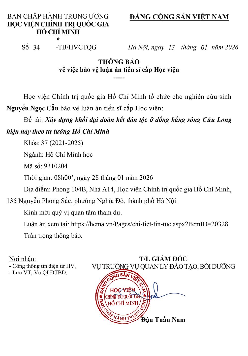 Thông báo bảo vệ luận án tiến sĩ cho Nghiên cứu sinh Nguyễn Ngọc Cẩn