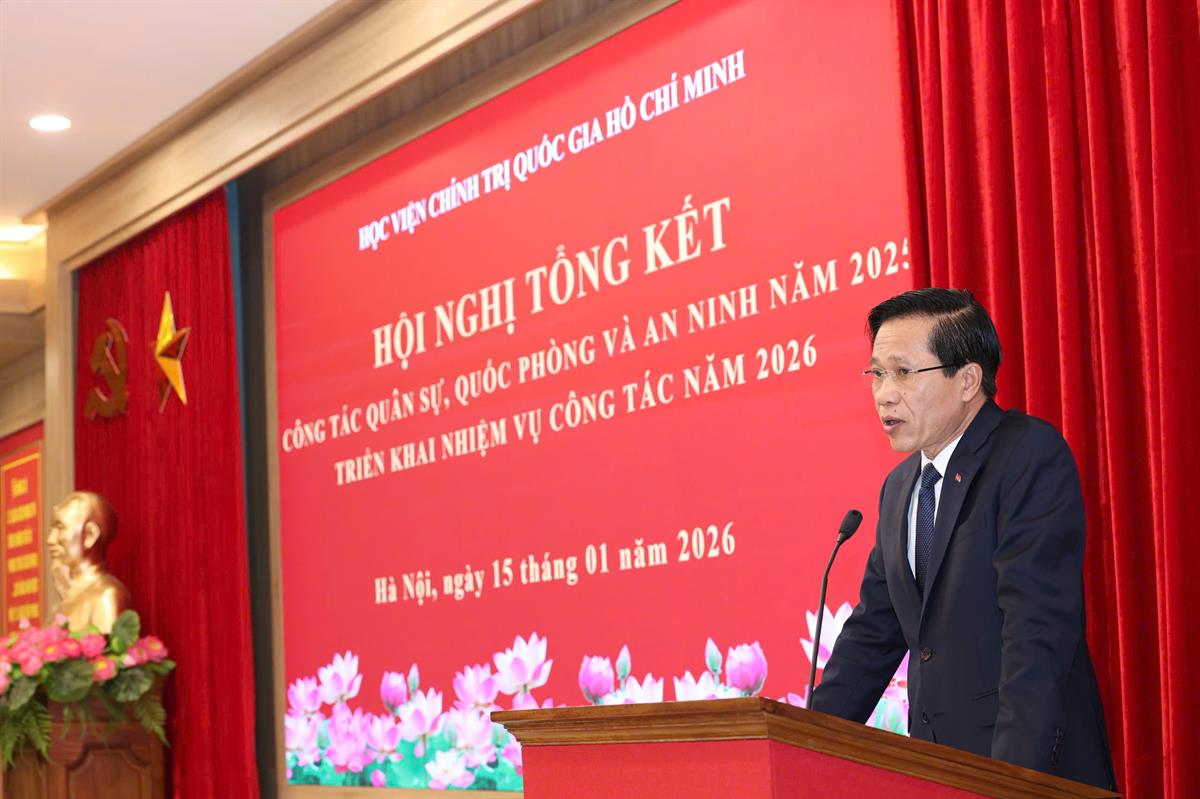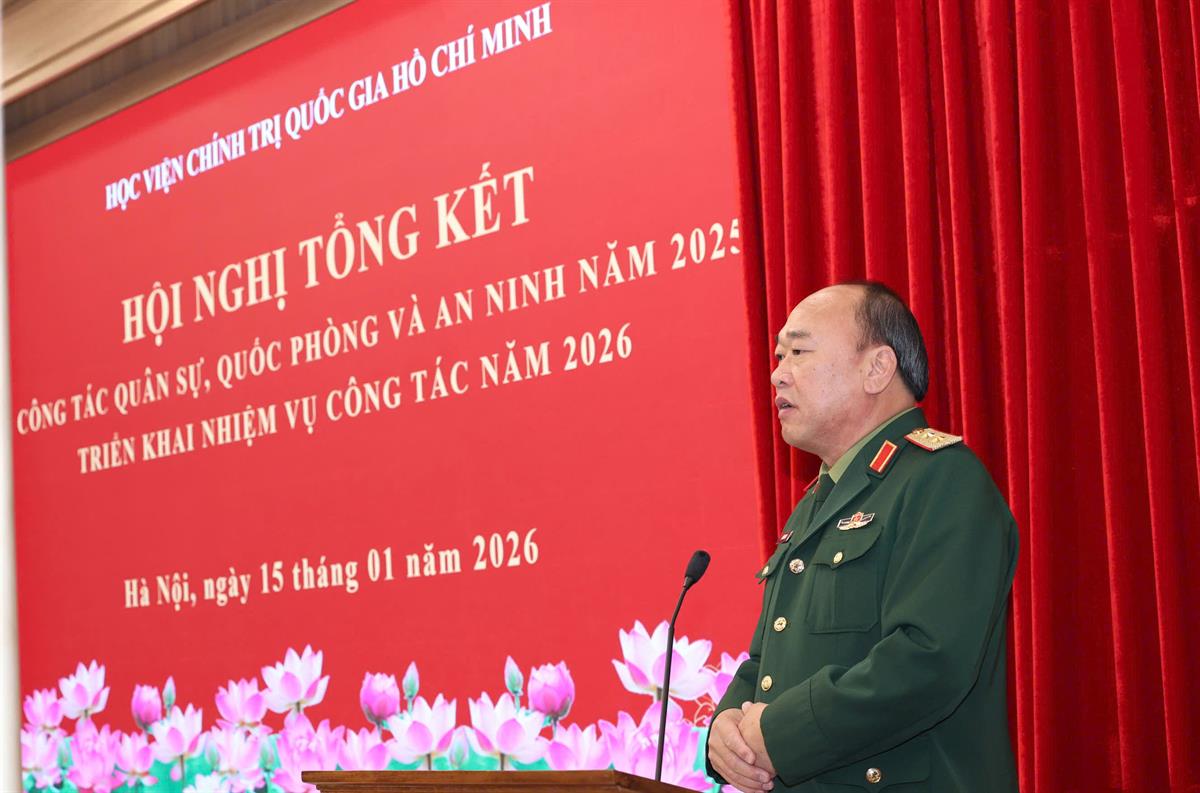 Phát biểu chỉ đạo tại Hội nghị, Trung tướng Lê Quang Đạo, Phó Tổng tham mưu trưởng Quân đội nhân dân Việt Nam ghi nhận, đánh giá cao và chúc mừng những kết quả mà Học viện Chính trị quốc gia Hồ Chí Minh đã đạt được trong công tác quốc phòng và an ninh năm 2025, đặc biệt trong bối cảnh Học viện vừa thực hiện trọng trách đào tạo, bồi dưỡng đội ngũ cán bộ chủ chốt cho hệ thống chính trị, vừa là trung tâm nghiên cứu, phát triển lý luận của đất nước.