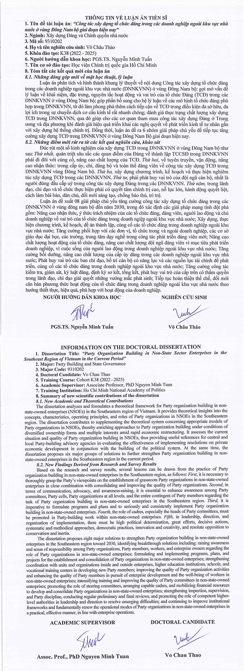 Nghiên cứu sinh Võ Châu Thảo tóm tắt những kết luận mới của luận án